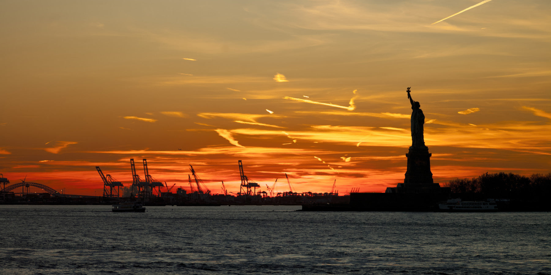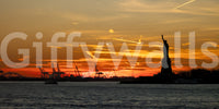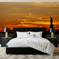 Statue of Liberty at sunset, New York. Capture the essence of freedom with this captivating wallpaper. The Statue of Liberty stands in silhouette against a vibrant sunset of orange and red, offering a dramatic focal point. This design adds a touch of modern sophistication to your living room, bedroom, or office. The dark tones against the bright sky create a powerful contrast, making it a great feature wall. Create a stunning space with this amazing wallpaper for walls, and let this iconic scene enrich your interiors.