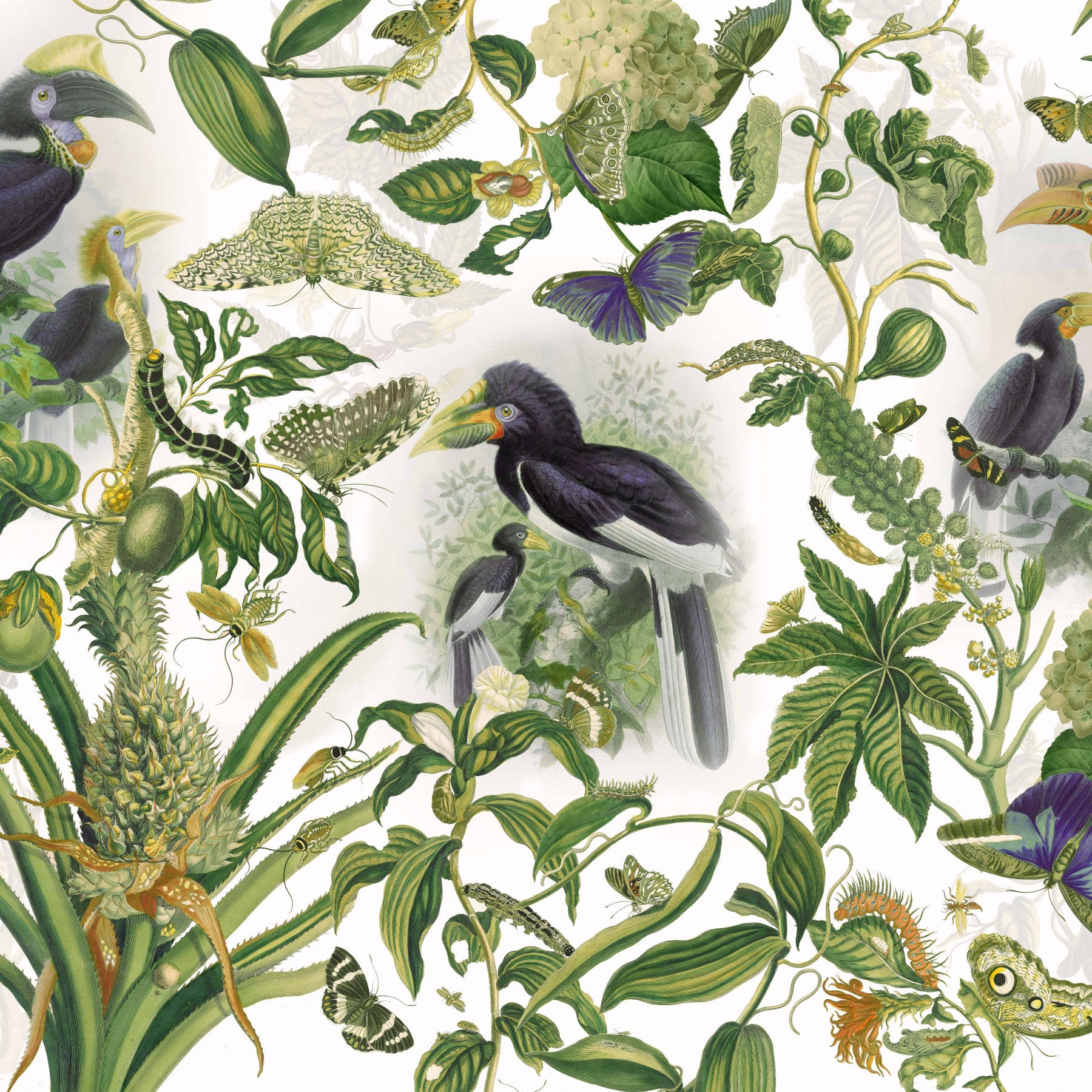 Immerse yourself in the vibrant tapestry of 'Life Jungle 02'. This wallpaper showcases a breathtaking array of meticulously detailed botanical illustrations interwoven with exotic birds and insects. Elegant hornbills perch amidst lush foliage, their vibrant plumage contrasting with the deep greens and creamy whites of the surrounding plants. Butterflies dance amongst caterpillars and creeping vines, capturing the cycle of life unfolding within a dense, tropical paradise. The exquisite detail and vintage aesthetic creates a serene yet captivating atmosphere, perfect for bringing the beauty of the jungle into your digital space.