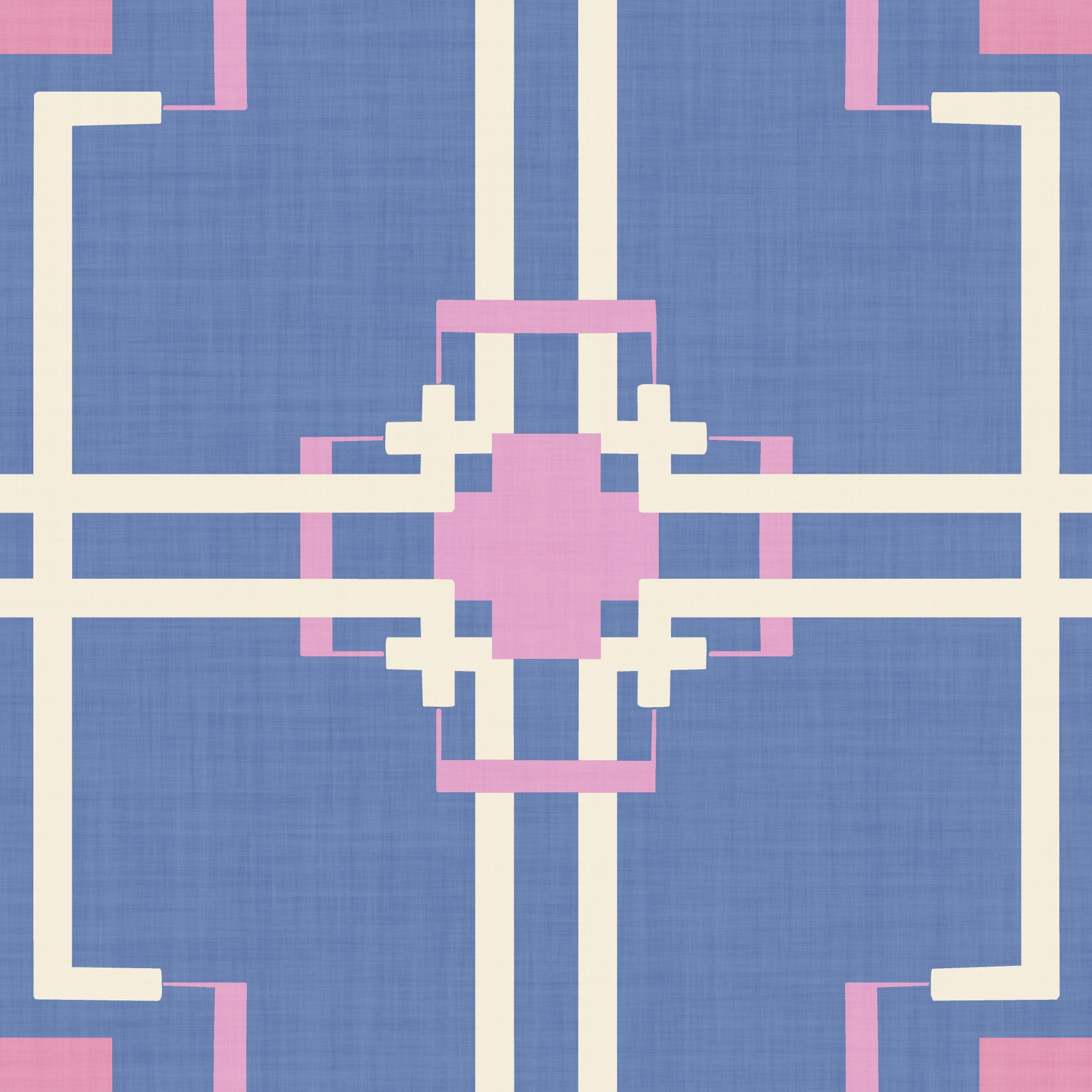 This abstract wallpaper design presents a symmetrical arrangement of lines and shapes, creating a modern, geometric pattern. The color palette combines a soft blue, pink, and cream. This versatile wallpaper for walls is suitable for many rooms. It enhances bedrooms with a calm vibe and living areas with a stylish backdrop. This wallpaper is perfect for adding an artistic flair to any interior.