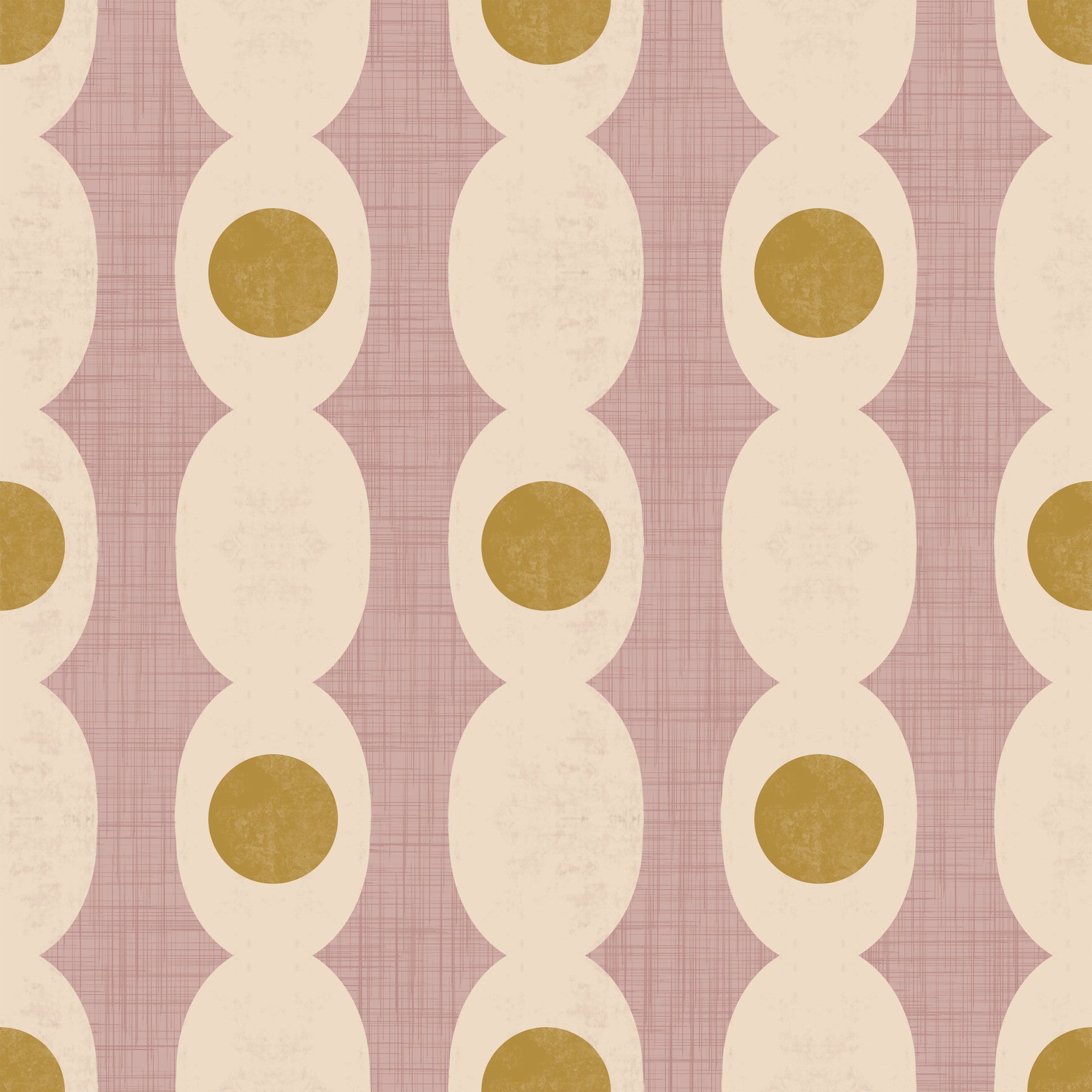 The Linked Mod Wallpaper Mural delivers a chic, retro-inspired style perfect for modern interiors. This sophisticated wall mural features vertical columns of pale, distressed oval links alternating with a textured mauve or dusty rose background. Central to each oval is a bold, mustard yellow circle, lending the design a striking mid-century geometry. This mural wallpaper is an excellent wallpaper for walls in bedrooms, hallways, or stylish living areas seeking a unique focal point. Installation is simple, allowing this high-quality wallpaper to effortlessly update your room with its artistic, timeless pattern.