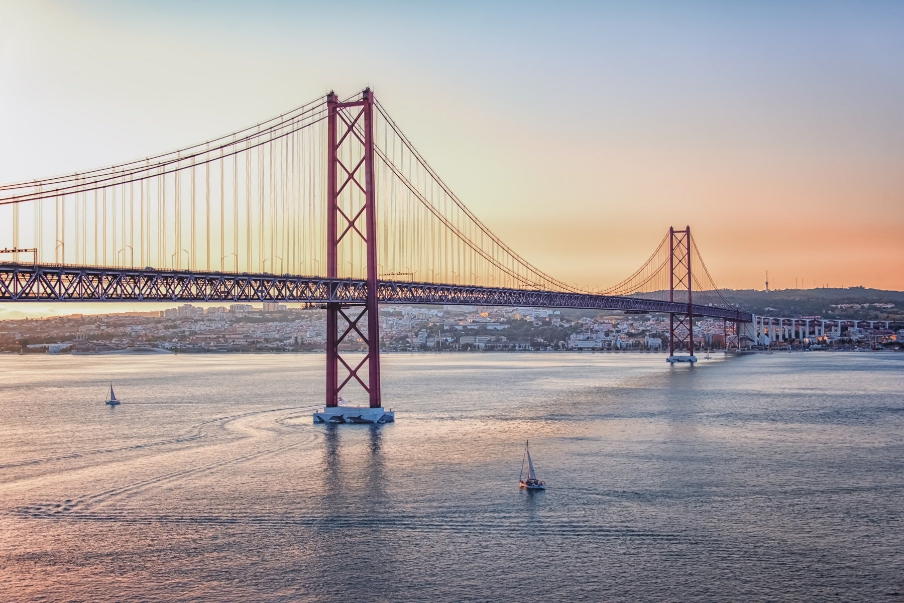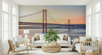 Embrace the allure of coastal scenery with this stunning image of the Lisbon Bridge. The design features a radiant sunrise sky over the famous landmark. The composition creates a focal point in any room, especially when you use the wallpaper for walls. Its warm color palette, with a mix of orange and blue, makes spaces feel inviting. Perfect for living rooms, bedrooms, or a reading nook, it adds charm and sophistication. The bridge evokes feelings of travel and exploration while providing a gorgeous backdrop.