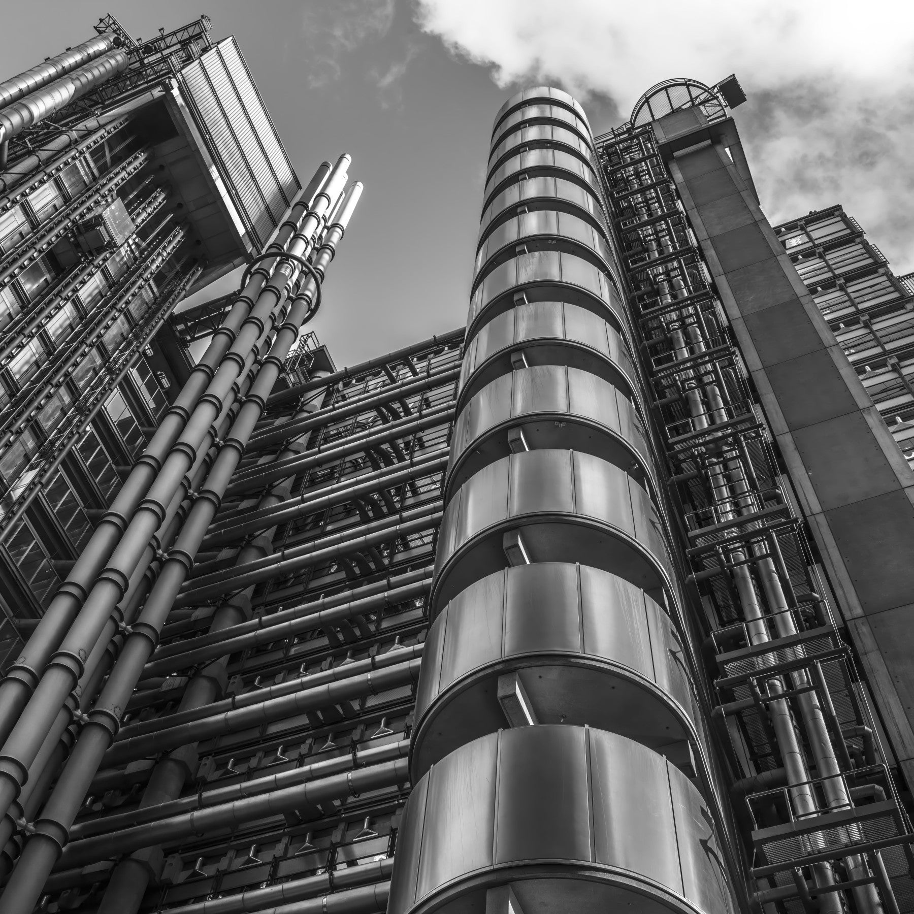 Low angle view of Lloyds building, London, UK This captivating wallpaper features the bold architecture of a modern building against a backdrop of a cloudy sky. The high-contrast black and white design adds visual interest and a touch of drama to any room. This impactful wallpaper for walls will transform an entryway, living room, or office. Its stark lines and geometric shapes complement contemporary and minimalist decor, lending an urban vibe to interior spaces.