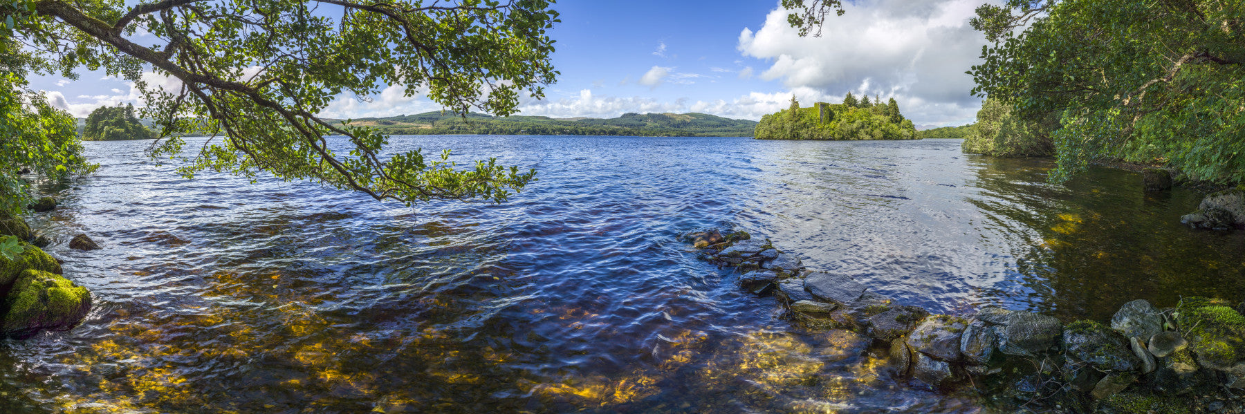 Loch Awe, Scotland. Transform your room with a stunning view of a Scottish Loch. The vivid blue water and the lush green island create a serene atmosphere. The image features natural elements like trees and mossy rocks. This image brings nature indoors, providing a relaxing and beautiful backdrop. It works well in living rooms, bedrooms, or even a home office. Choose this wallpaper for walls to create a calm, natural ambiance that enhances your space.