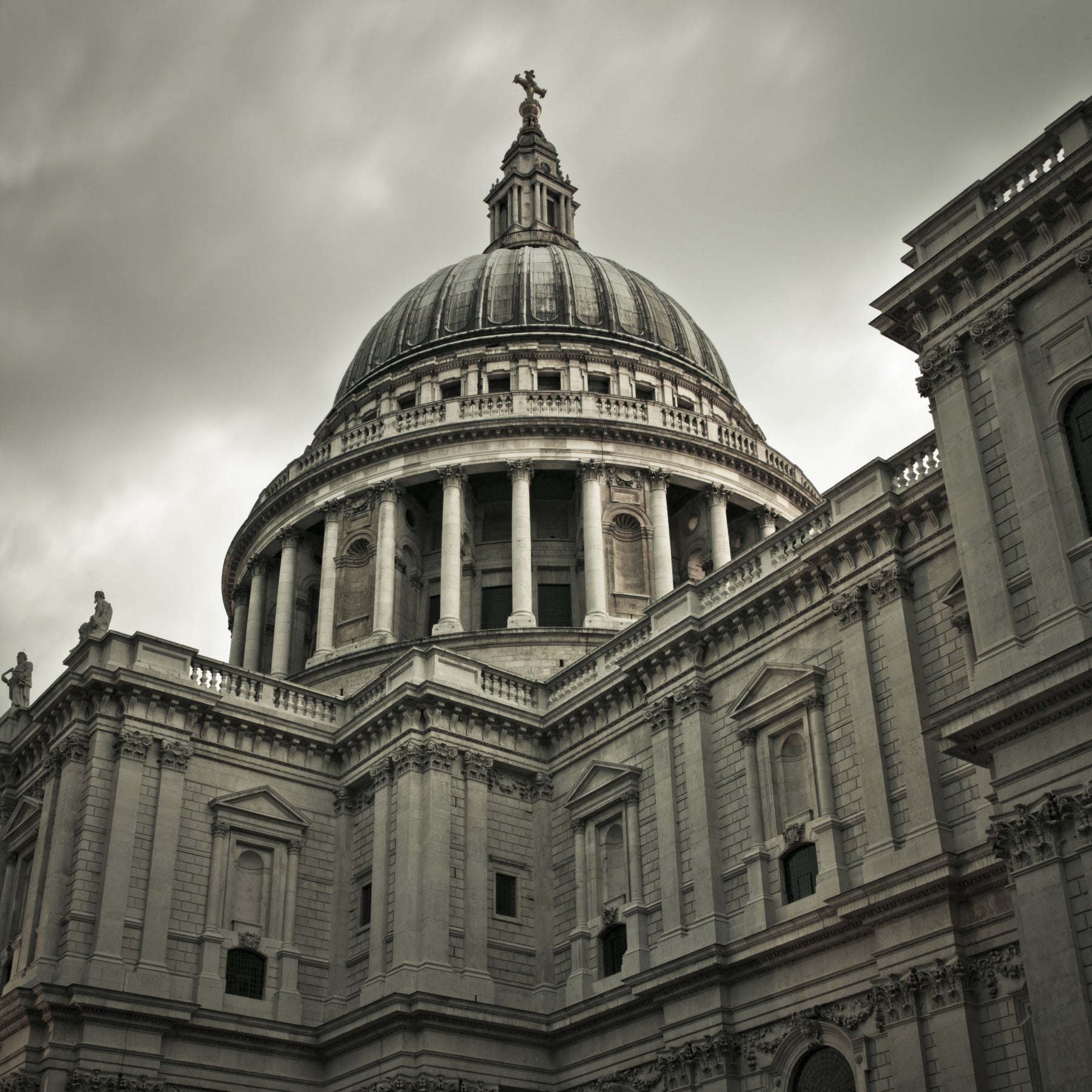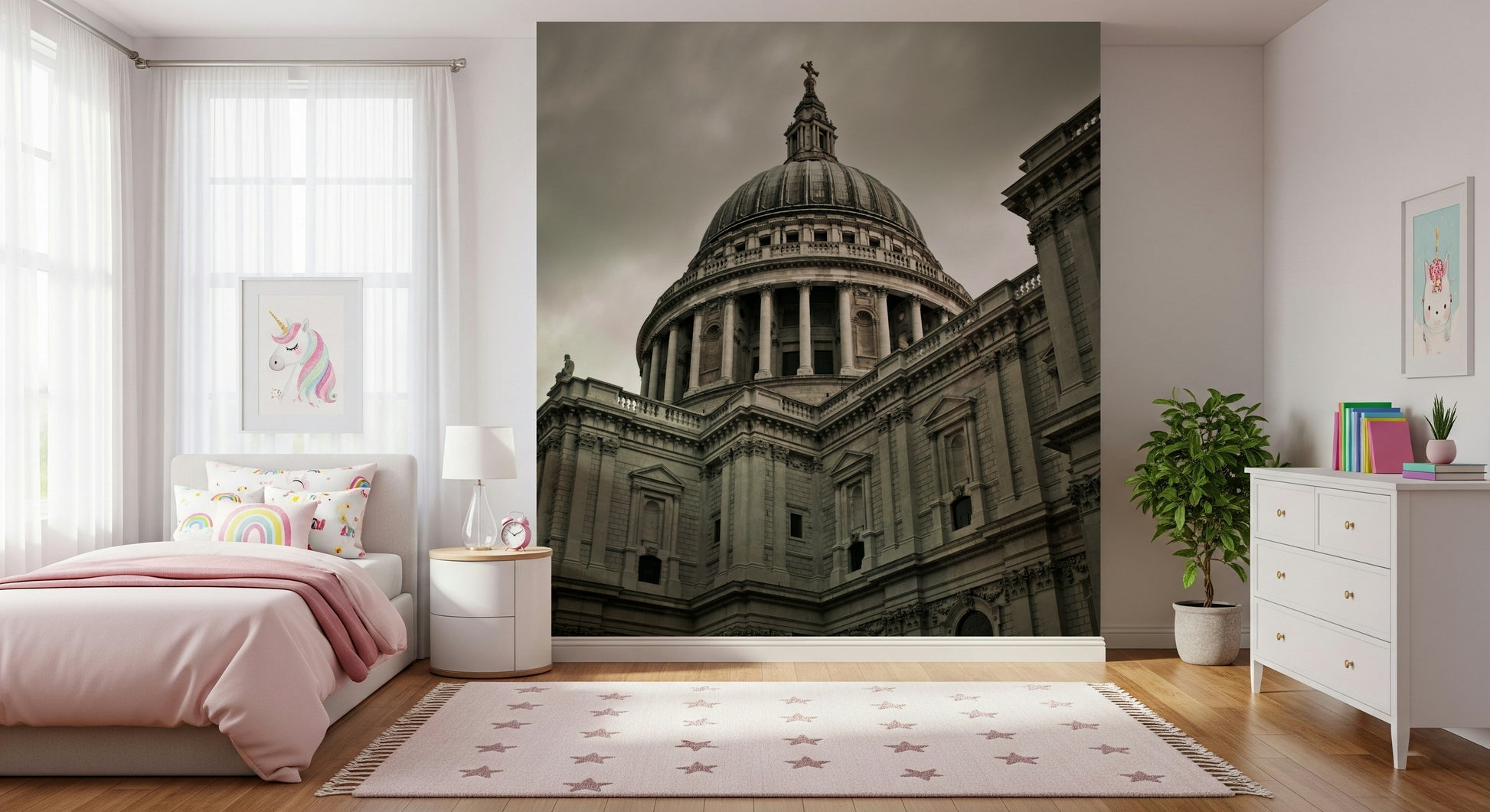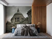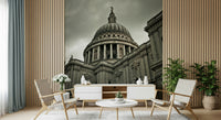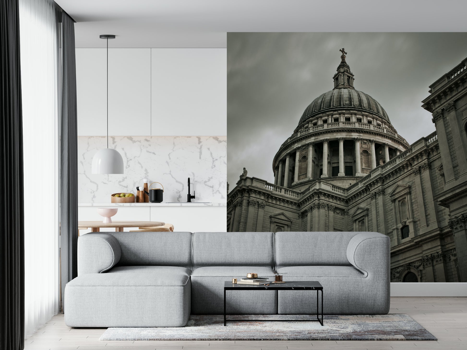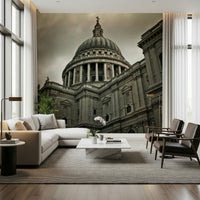 Elevate your interior with this magnificent architectural wallpaper for walls. The design captures a powerful view of a grand cathedral, offering a dramatic focal point for any room. Its imposing dome, framed by detailed columns and intricate stonework, brings a sense of historical gravitas and refined elegance. The muted, grayscale palette exudes sophistication, making it an ideal choice for a study, living room, or hallway seeking a touch of timeless style. Add depth and character, and allow this impressive image to command attention while harmonizing with existing decor.