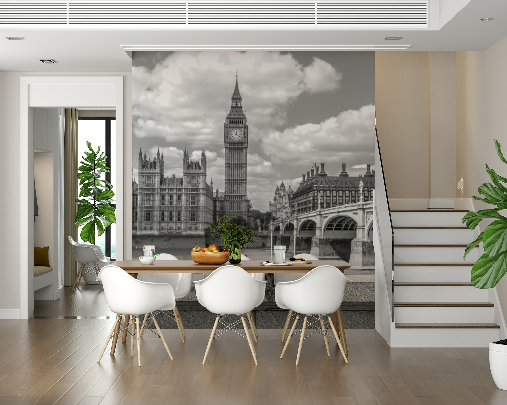 Capture the spirit of London with this striking wallpaper for walls. The design focuses on the iconic Big Ben and Houses of Parliament in a classic monochrome palette. A burst of vivid red roses and a charming hat add a touch of romance. This design brings a sophisticated and timeless feel to your living room, bedroom, or hallway. It offers a unique blend of classic architecture and modern flair, transforming your space into a stylish tribute to one of the world's most beloved cities.