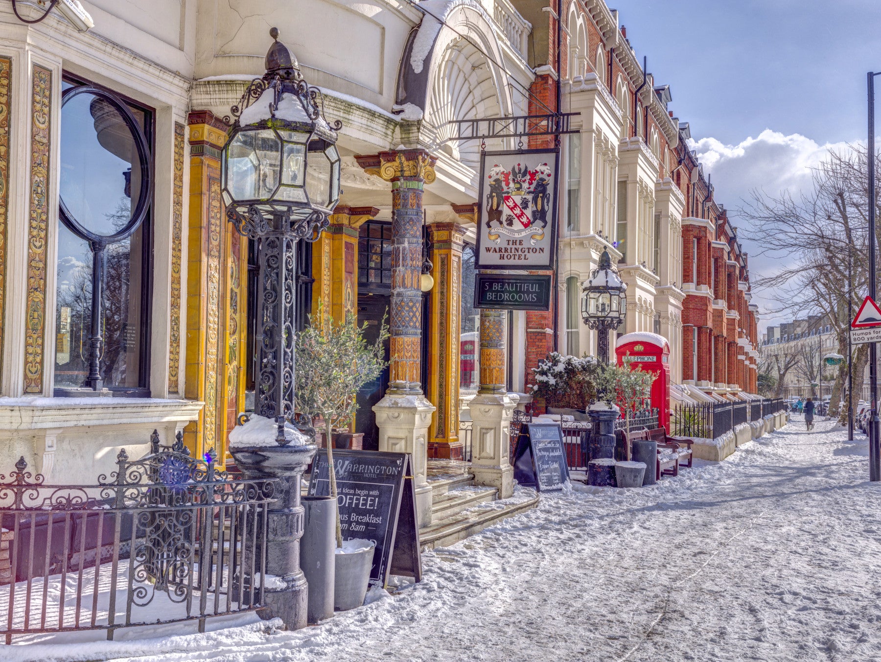 Maida Vale in snow, London. Capture the essence of a snowy London street with this wallpaper for walls. It presents a classic hotel facade, complete with ornate lamps and iconic red phone boxes, blanketed in winter white. The color palette balances brick reds and snowy whites with touches of gold in the building's details. Ideal for living rooms or hallways, this design brings a sophisticated, historical feel to any space, evoking a sense of travel and urban elegance. It complements interiors with its refined patterns.