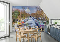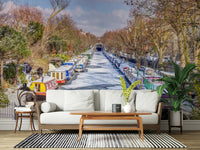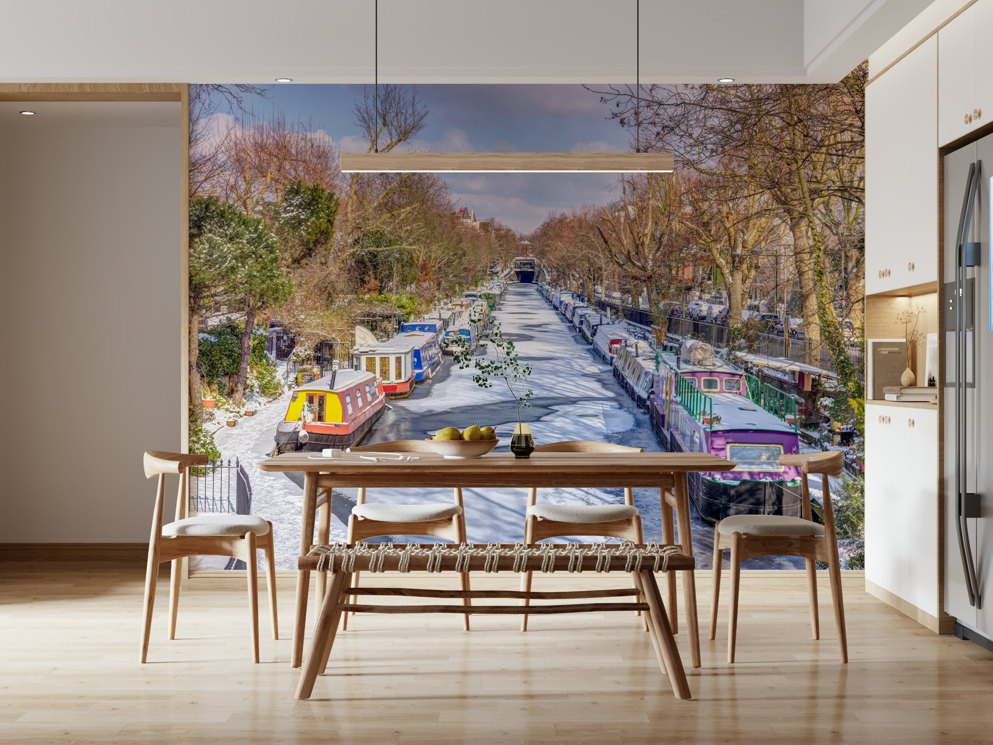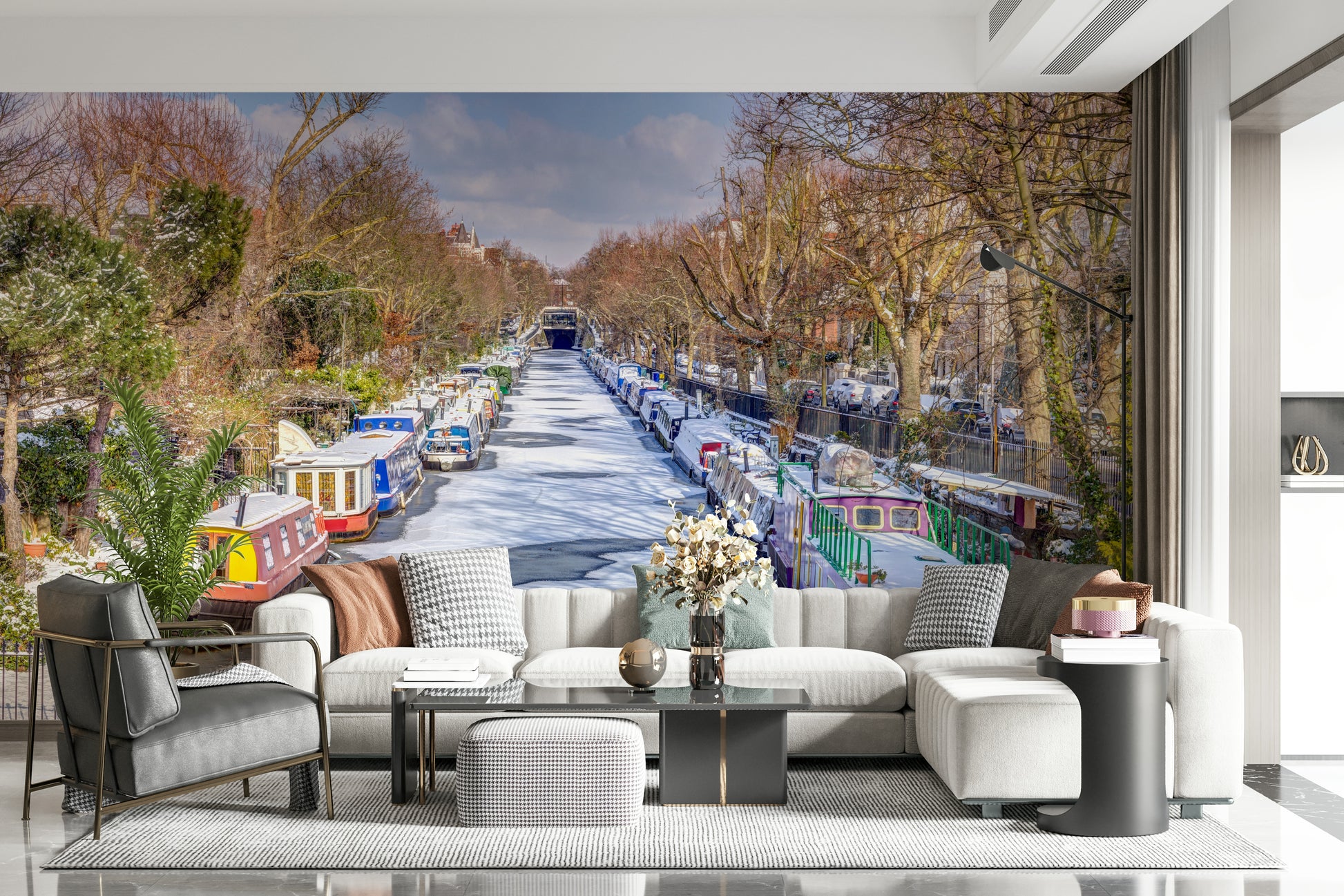 Experience the enchanting beauty of London's canals in winter with this captivating wallpaper. The image showcases a picturesque stretch of waterway draped in a pristine layer of snow. A collection of charmingly colorful houseboats are moored along the banks, adding pops of bright color against the white landscape. Bare trees, dusted with snow, frame the scene, leading the eye towards a distant tunnel. The partially frozen canal adds a touch of winter magic, creating a serene and peaceful ambiance. Perfect for anyone who appreciates the unique charm of London and the beauty of winter.