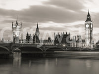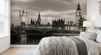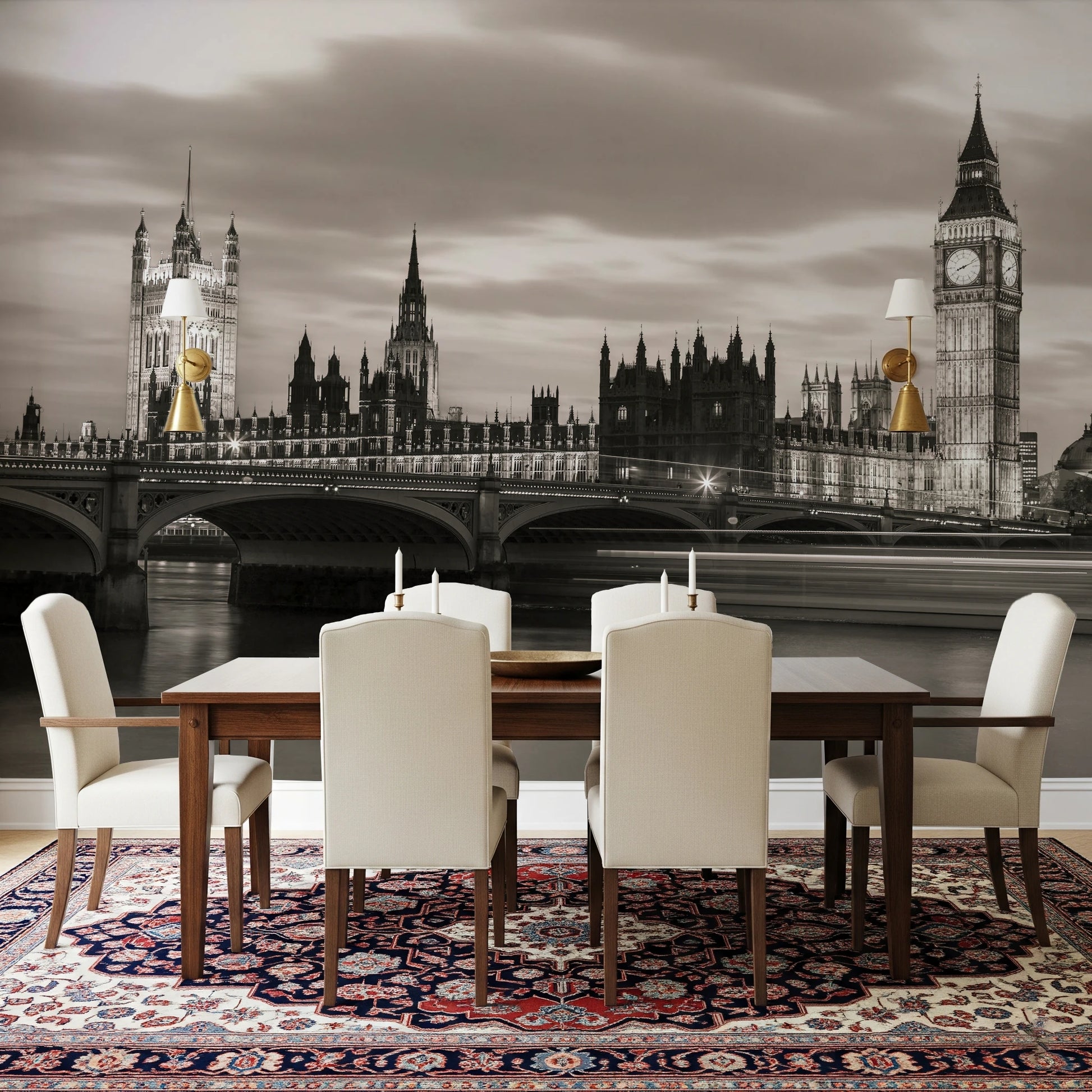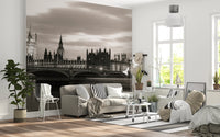 England, London, Westminster bridge. Transform your living space with a timeless architectural design. This wallpaper for walls captures the iconic Houses of Parliament and Big Ben in a sophisticated sepia tone. The classic London skyline lends a sense of history and grandeur to any room. The monochrome palette makes it versatile enough to enhance various interior styles, from modern minimalist to traditional decor. Consider adding it to your living room, study, or hallway to create a captivating focal point. Experience the allure of London's charm every day with this elegant statement.