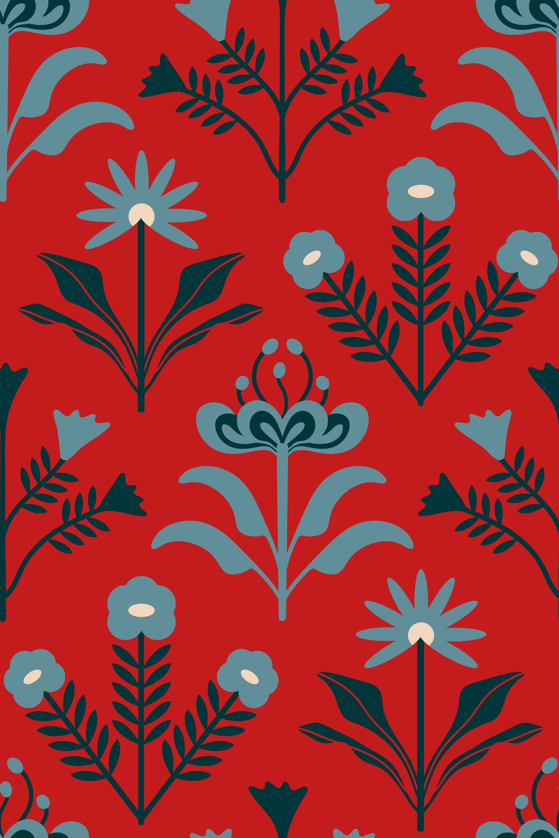 Step back in time with Lora a wallpaper that beautifully marries retro Mid-Century Modern style with a touch of Scandi simplicity and cottagecore floral charm. This floral pattern features charming flowers in a palette of powder blue, navy indigo and white flowers against a rich deep red background, creating a dramatic and inviting atmosphere. The minimalist yet eye-catching flowers evoke a sense of nostalgia and handcrafted beauty, perfect for bringing a touch of moody elegance to any space. Its clean lines and balanced composition embody Scandinavian aesthetics, while the retro floral motifs add a playful and vibrant touch. This pattern design is also available in Other Colourways too! Original wallpaper pattern design by Jackie Tahara of UnBlink Studio.