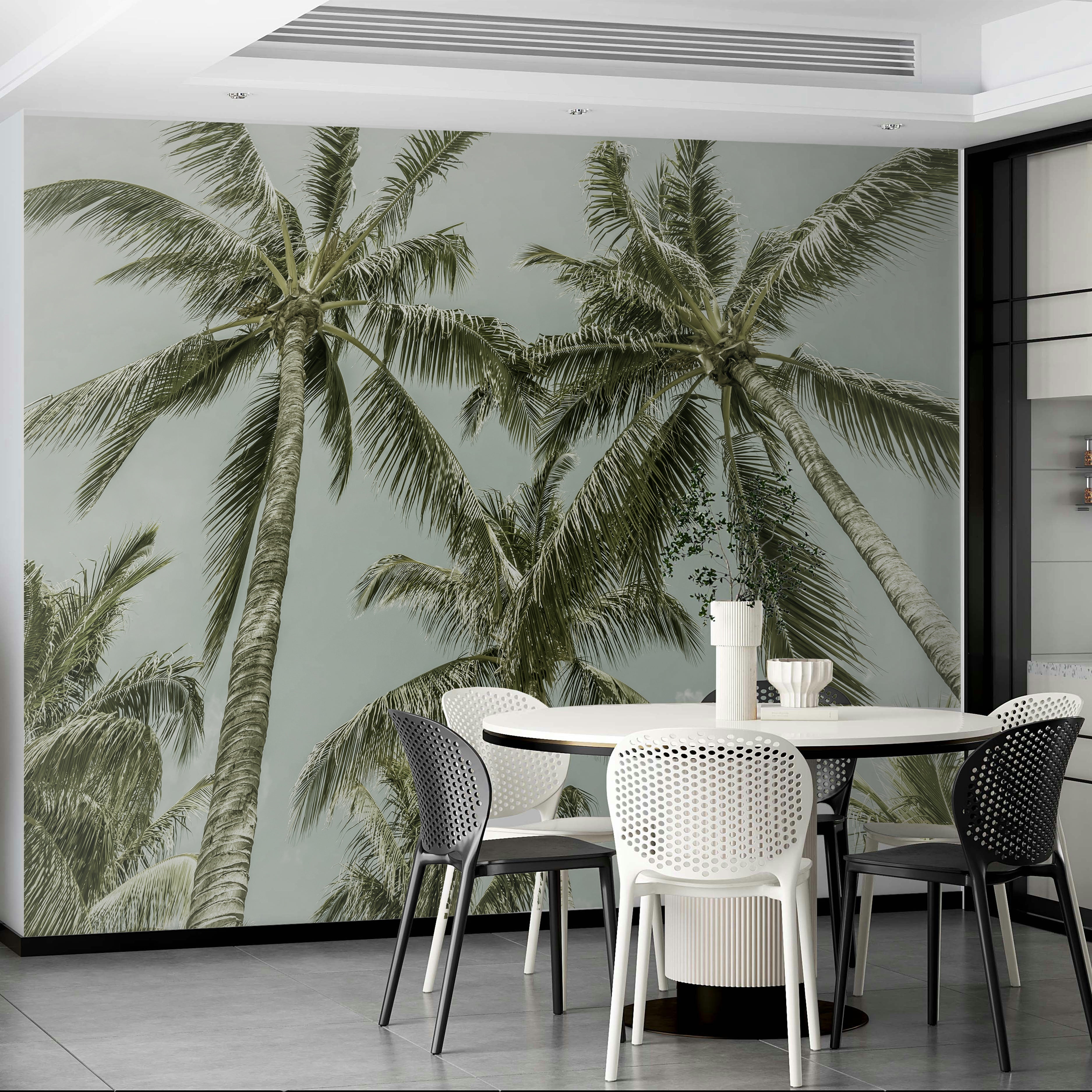 Escape to a tranquil tropical paradise with this vintage-inspired wallpaper. The image features a breathtaking low-angle view of several majestic palm trees reaching towards a soft, pastel sky. This wallpaper evokes a sense of calm and serenity, perfect for adding a touch of vintage-inspired beach elegance to your home. The muted color palette and the upward perspective bring a peaceful and dreamy quality to this stunning portrayal of nature's beauty.