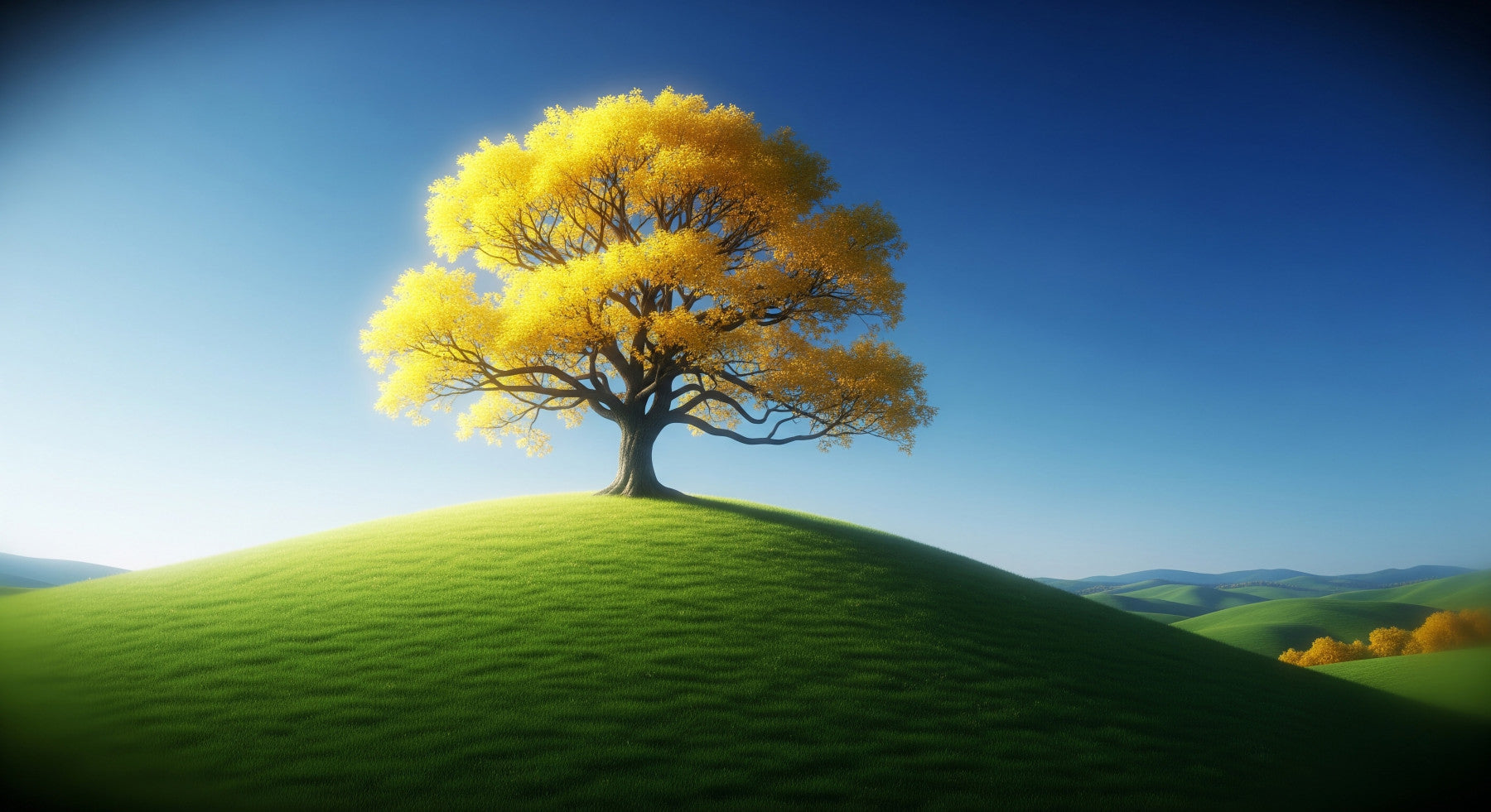 Infuse your interior spaces with a touch of natural elegance. This wallpaper for walls features a radiant tree with shimmering gold foliage, set against a backdrop of rolling hills and a serene blue sky. The gentle color palette brings a sense of openness and calm to any room. It works beautifully in living rooms, bedrooms, and dining areas, adding a touch of sophistication and tranquility. The design enhances the feeling of space and light, creating an inviting atmosphere. This striking piece gives your space a natural focal point.