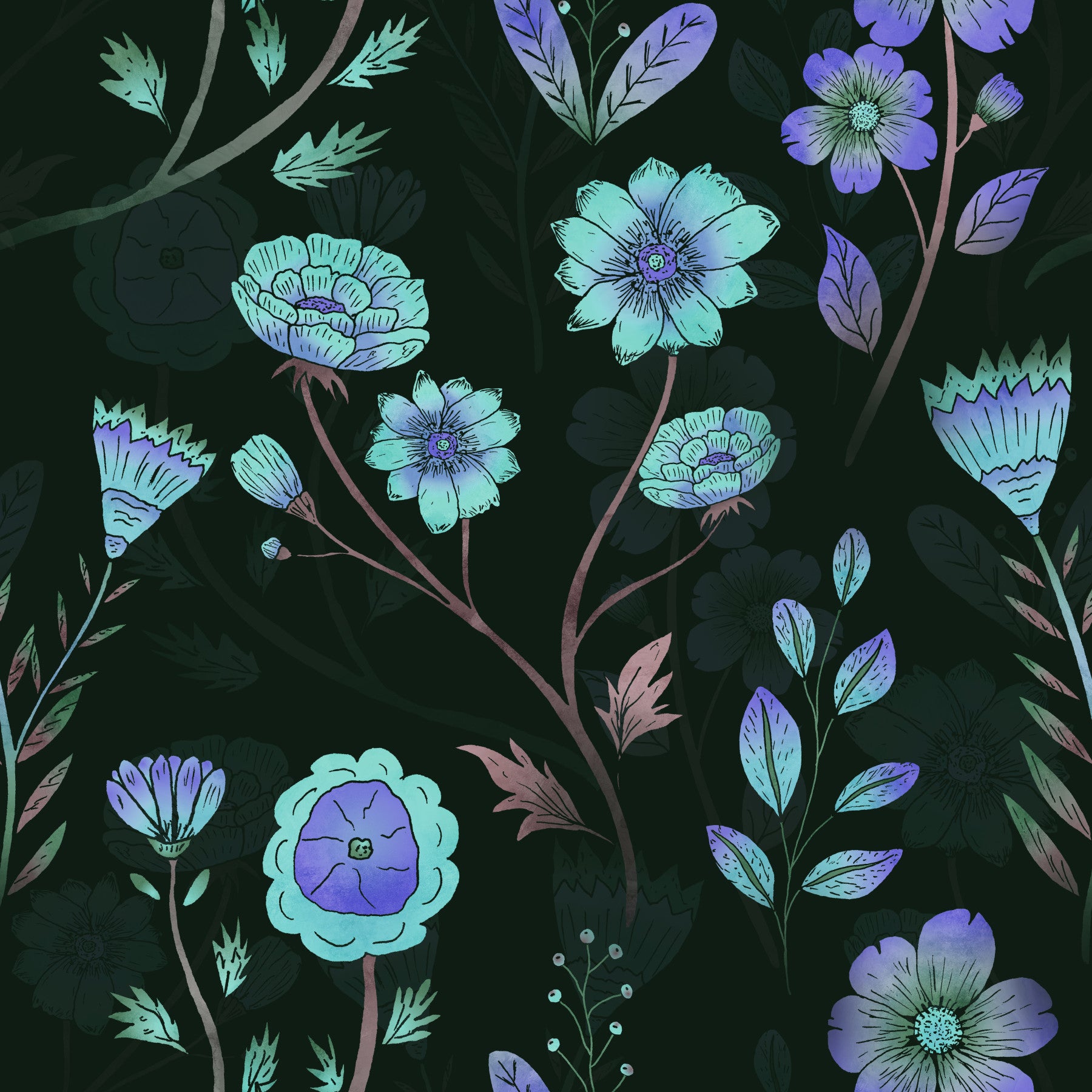 The Luminous Floral Whispers Bluish Tones wallpaper features delicate flowers and leaves in glowing shades of blue, teal, and violet against a deep black background. This wallpaper for walls adds a mysterious and elegant botanical touch, perfect for bedrooms, lounges, or accent walls that need a dramatic yet calming effect. The softly illuminated floral designs create a dreamy and sophisticated atmosphere, ideal for modern and contemporary interiors. Easy to install as mural wallpaper, it brings subtle light and quiet beauty to your space, transforming your walls with a gentle, ethereal glow.