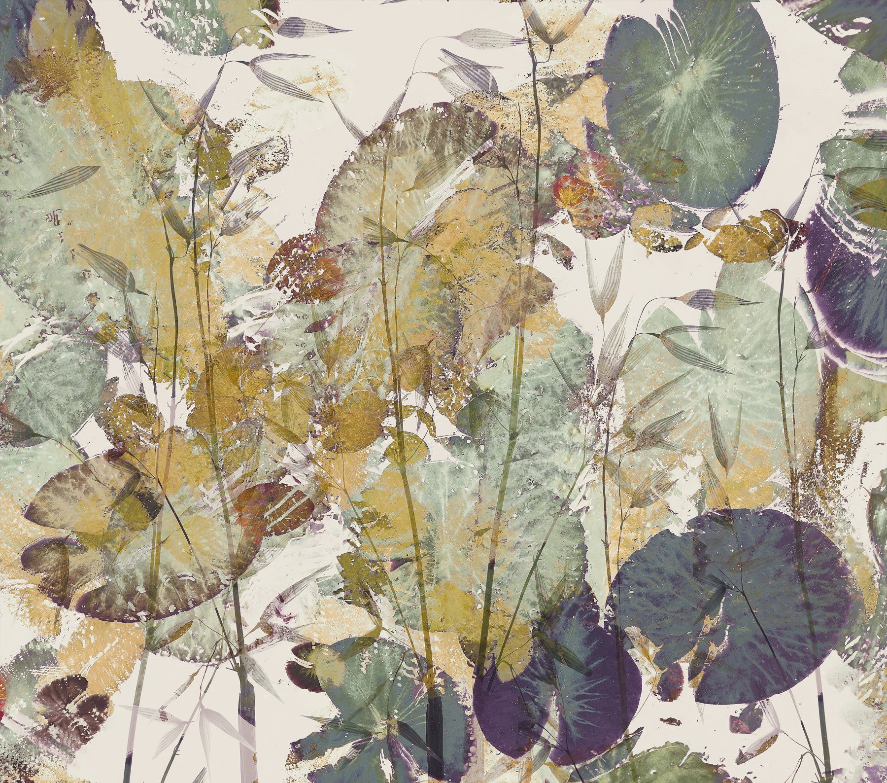 Transform your space with this captivating design. Overlapping leaves in a spectrum of muted green, gold, and violet create a layered, textured effect. The abstract style introduces depth and visual intrigue to your walls. Ideal for living rooms, bedrooms, or hallways, it adds subtle sophistication. Using this wallpaper for walls creates a unique look that complements interiors with a touch of modern, natural elegance.