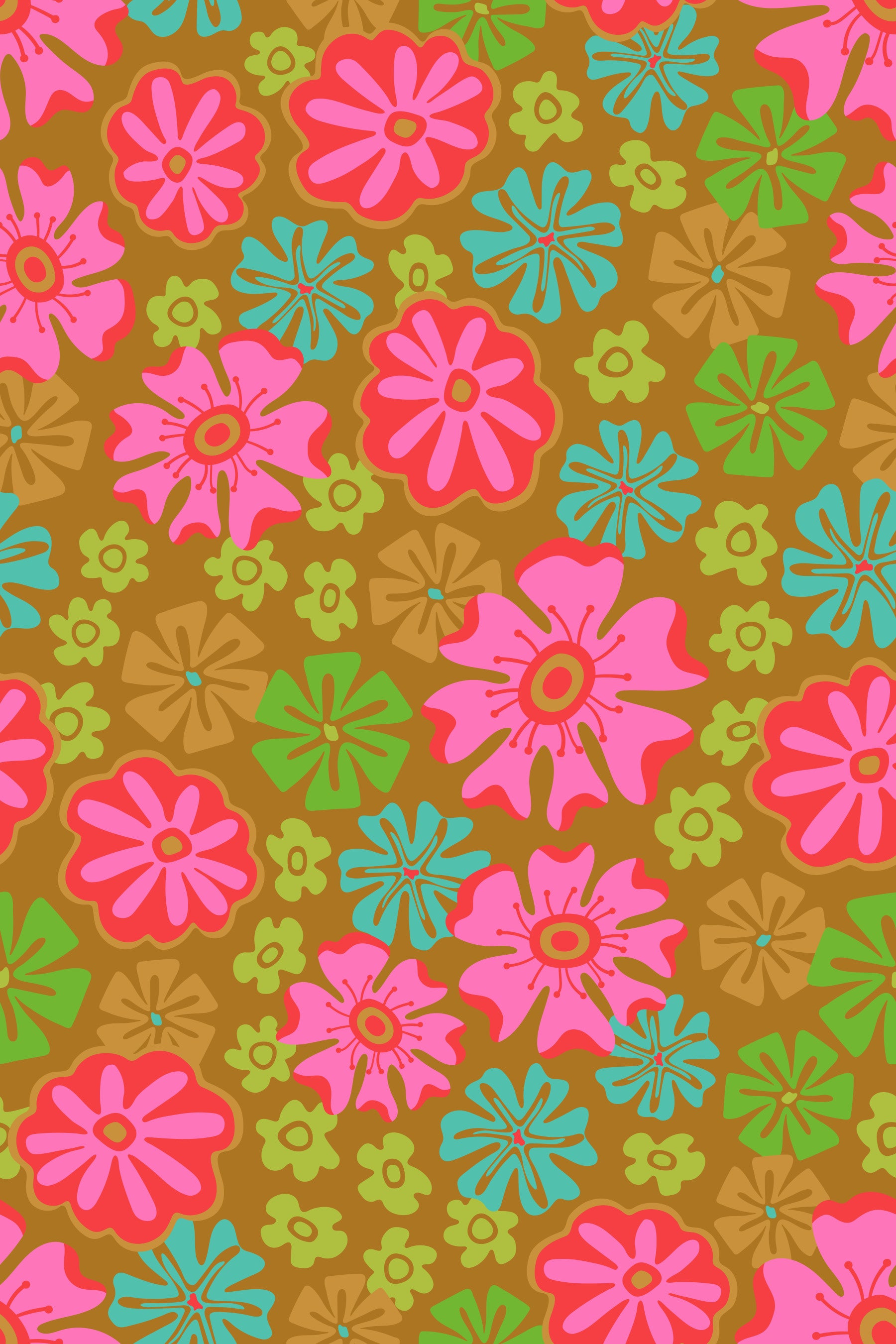 Escape to a vibrant paradise with our brightly-coloured Lush tropical big bloom floral wallpaper. This design bursts with energy, featuring oversized flowers in a dazzling palette of bright pink, passionate red, lush green and sky blue on an earthy brown background. The stylized botanical elements create a bold, retro-chic aesthetic reminiscent of vintage Hawaiian tropical prints, perfect for making a statement in any room. Infuse your space with a playful, bohemian yet sophisticated ambiance. Transform your walls into a blooming oasis and enjoy the cheerful vibes of this captivating floral fantasy. Ideal for those who crave a touch of vintage charm mixed with vibrant, modern Maximalism! Original wallpaper pattern design by Jackie Tahara of UnBlink Studio.