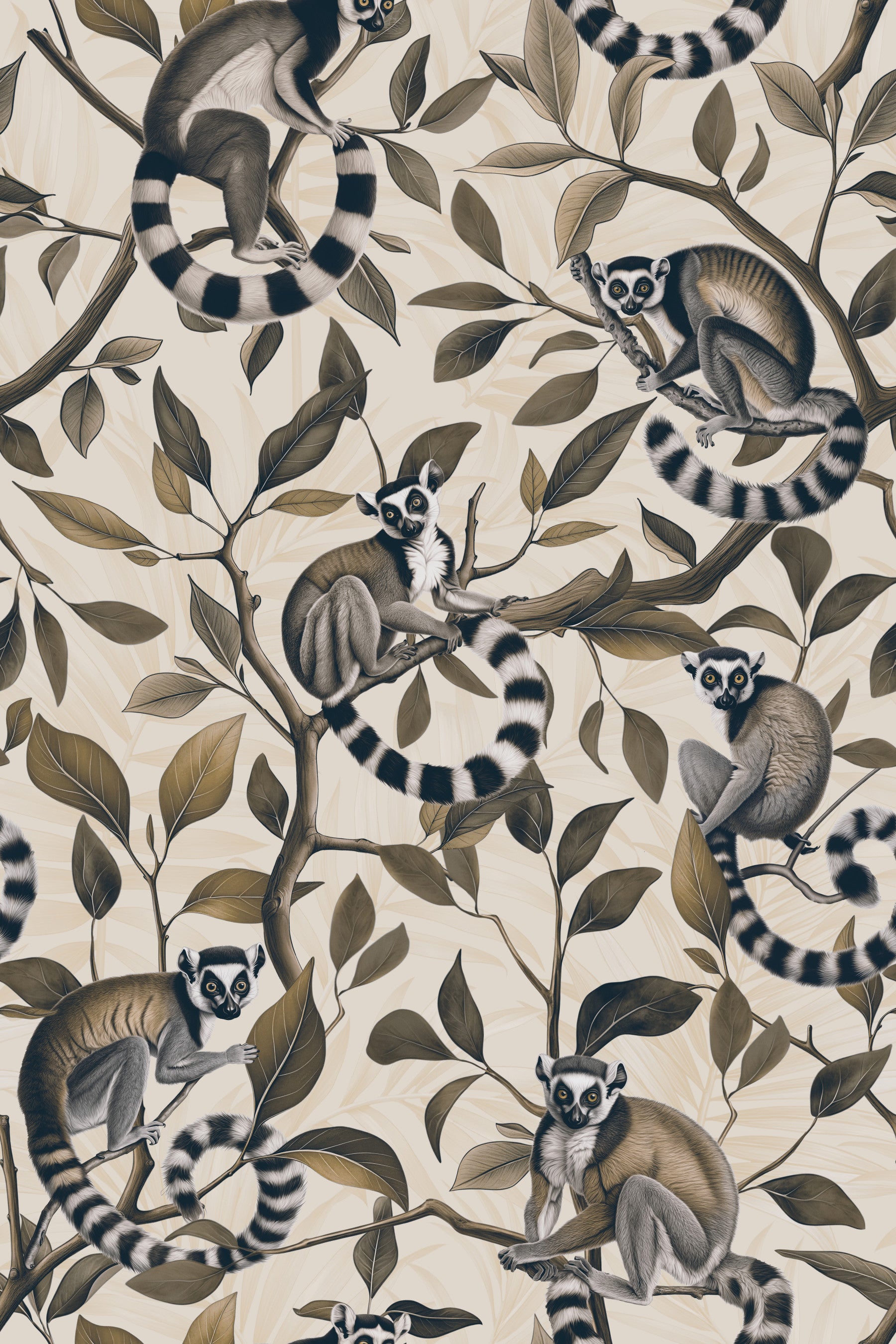 Lush Tropical Lemur Monkey Paradise Wallpaper captures the playful charm of lemurs resting on delicate tree branches. The mural wallpaper features detailed lemur illustrations with striking tails and expressive eyes, surrounded by stylized tropical leaves in warm, earthy tones. Perfect for kids’ rooms, play spaces, or quirky home corners, this wall mural offers both fun and balance. The soft beige background keeps the overall look grounded, while the animals bring energy. A great wallpaper for walls where personality and pattern meet—ideal for creating a nature-inspired, imaginative space with a calm palette and curious spirit.