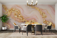 Adorn your walls with this stunning wallpaper for walls, a blend of blush hues and gilded details. Its design mimics the fluidity of marble with an added opulent touch, making it ideal for areas needing a spark of sophistication. The combination of pale pink, grey and bold gold accents complements interiors from minimalist to Art Deco, adding texture and visual interest to bedrooms, hallways or home offices.
