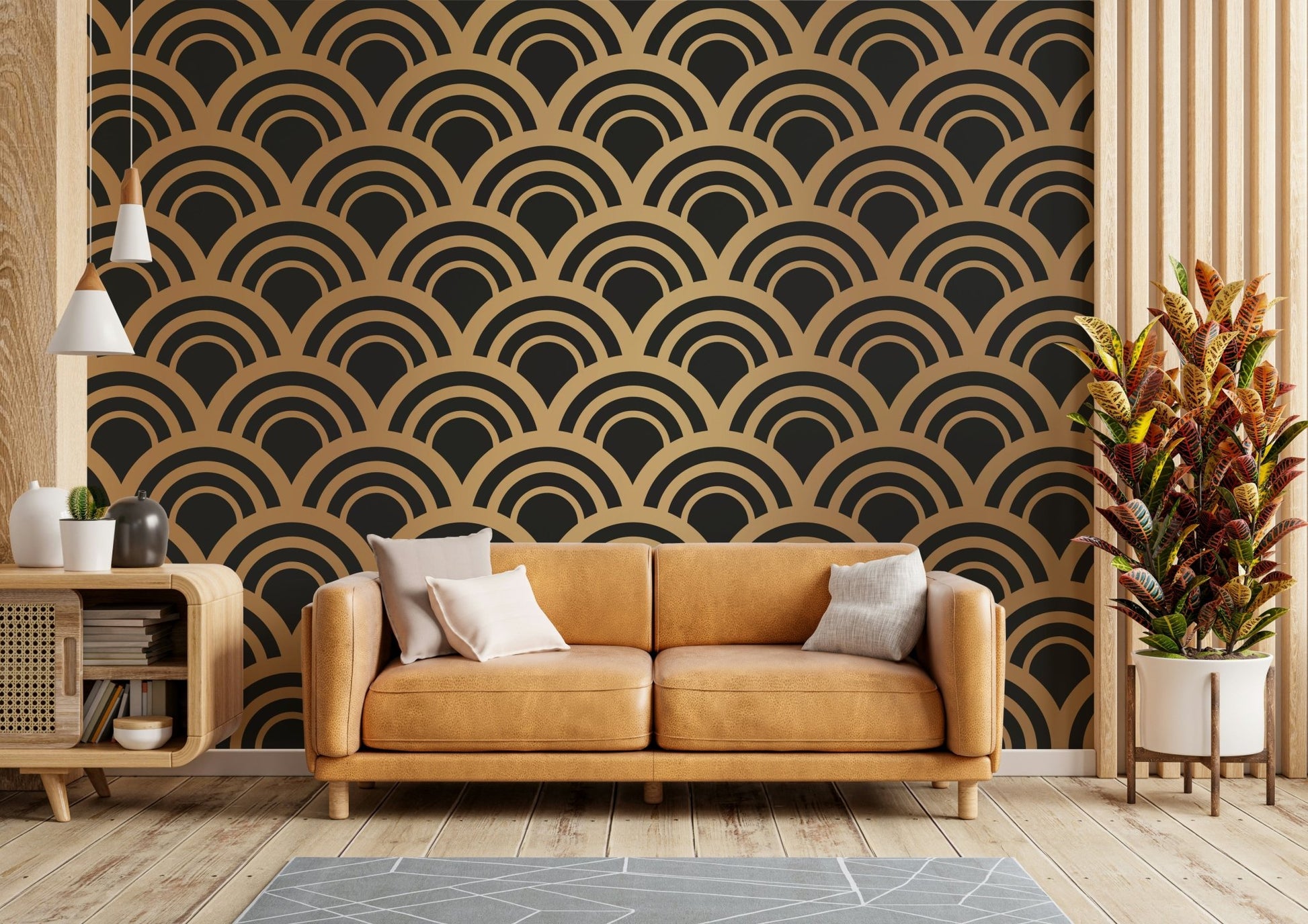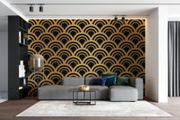 Transform your space with this stunning gold and black art deco wave pattern wall mural. The elegant geometric design adds a touch of luxury and sophistication, perfect for modern living rooms, bedrooms, or offices. This bold wallpaper brings timeless style to any interior.