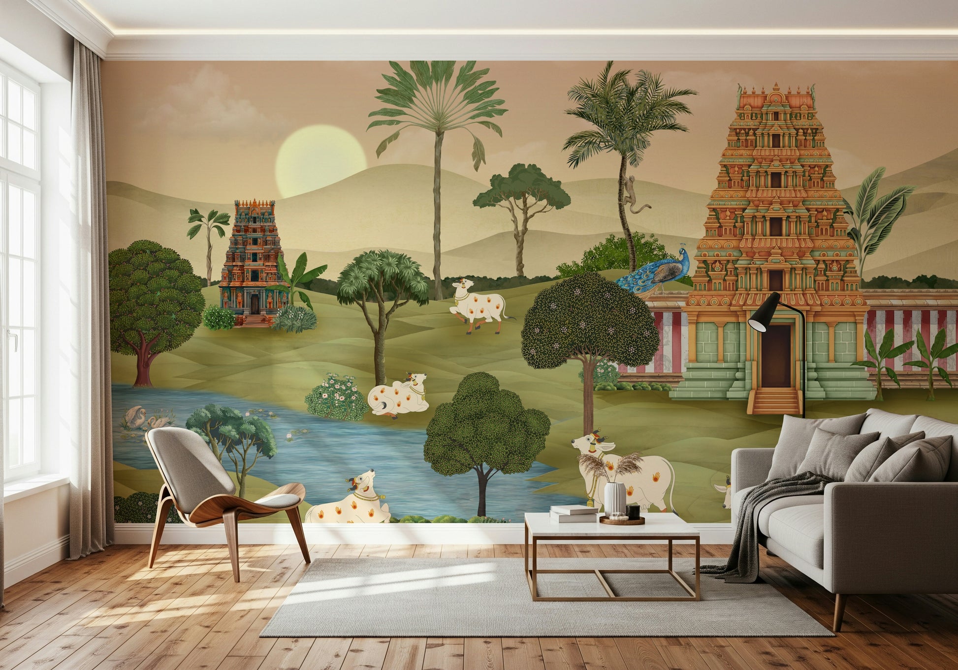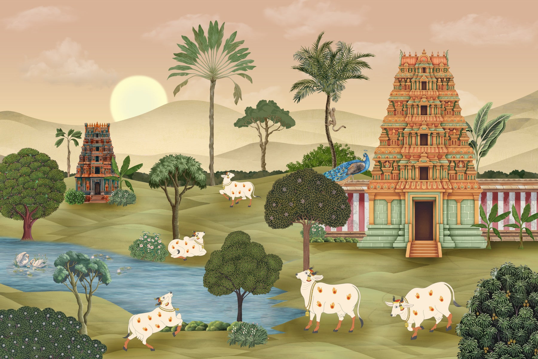 Step into the serene and captivating world of 'Madhuban Moonlight'. This exquisite wall décor transports you to a tranquil landscape bathed in the soft glow of the moon. Ancient temples, adorned with intricate details, stand majestically amidst lush greenery and towering palm trees. Sacred cows roam freely, their presence adding a touch of divine grace to the scene. The pastel color palette evokes a sense of peace and tranquility, creating a soothing ambiance in any space. A gentle stream meanders through the landscape, reflecting the moonlight and enhancing the overall dreamlike quality of the design. A proud peacock and playful monkey add to the whimsical beauty of this enchanting haven. Transform your living room, bedroom, or study into a serene retreat with this visually stunning piece of art. It's a celebration of nature, spirituality, and timeless beauty for your walls.