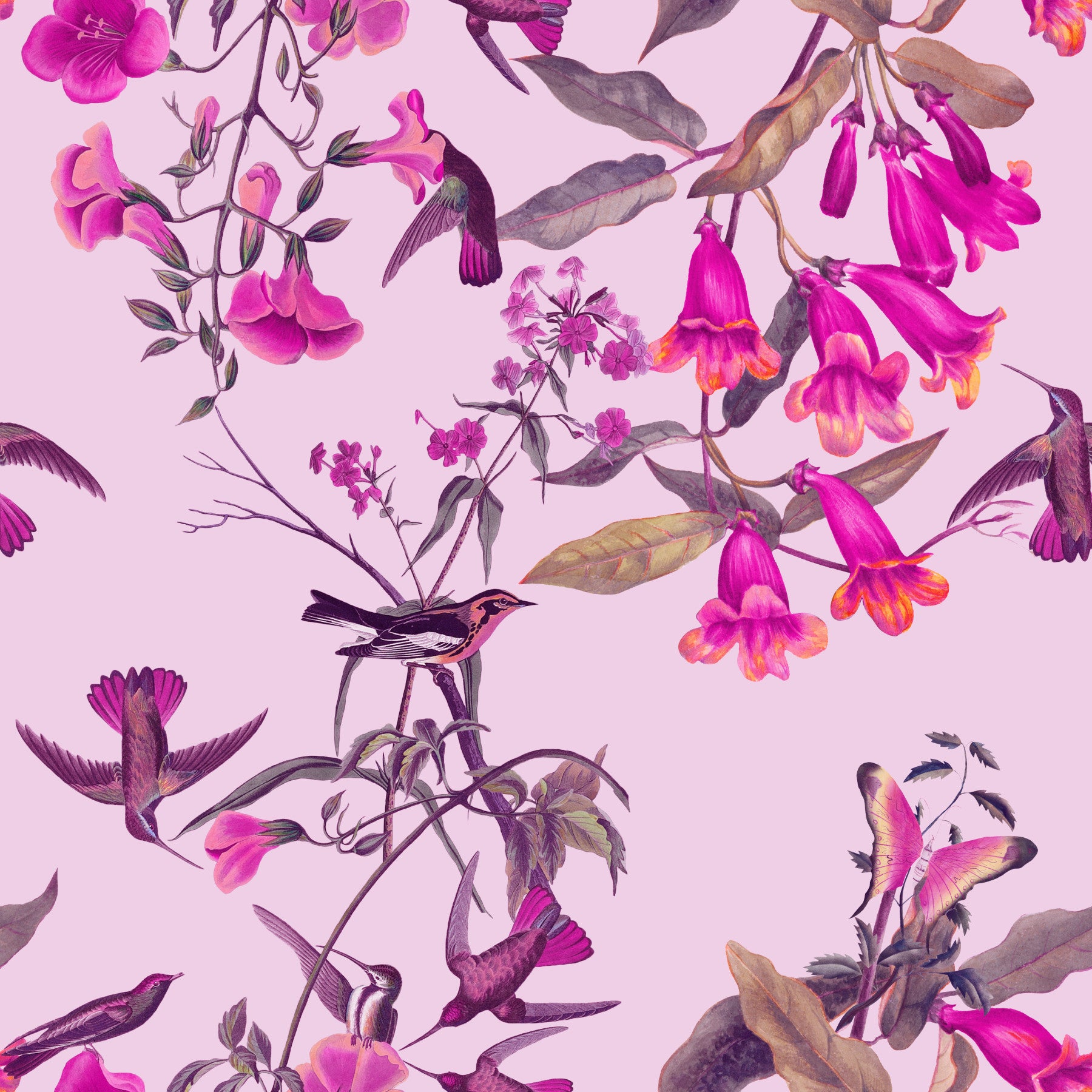 A beautiful magenta garden wallpaper mural with exotic birds.