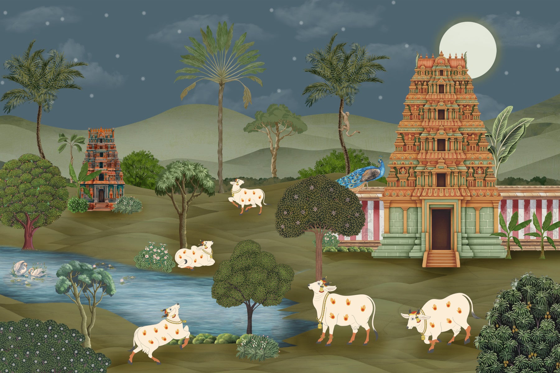 Adorn your walls with 'Mandir Majesty,' a captivating scene blending serene spirituality with tranquil nature. This piece presents majestic temples nestled amidst a lush landscape, bathed in the soft glow of a full moon under a starlit sky. Sacred cows graze peacefully, their adorned bodies adding a touch of auspiciousness. Palm trees sway gently in the breeze, creating a calming rhythm in the scene. A graceful peacock perches proudly, adding a vibrant splash of color. The intricate architecture of the temples, rendered in warm hues, evokes a sense of history and devotion. A gently flowing river mirrors the celestial glow, enhancing the overall feeling of harmony and peace. Bring the spiritual essence and serene beauty into your living space with this sophisticated piece of wall art. Let the 'Mandir Majesty' transform your walls into a serene sanctuary.