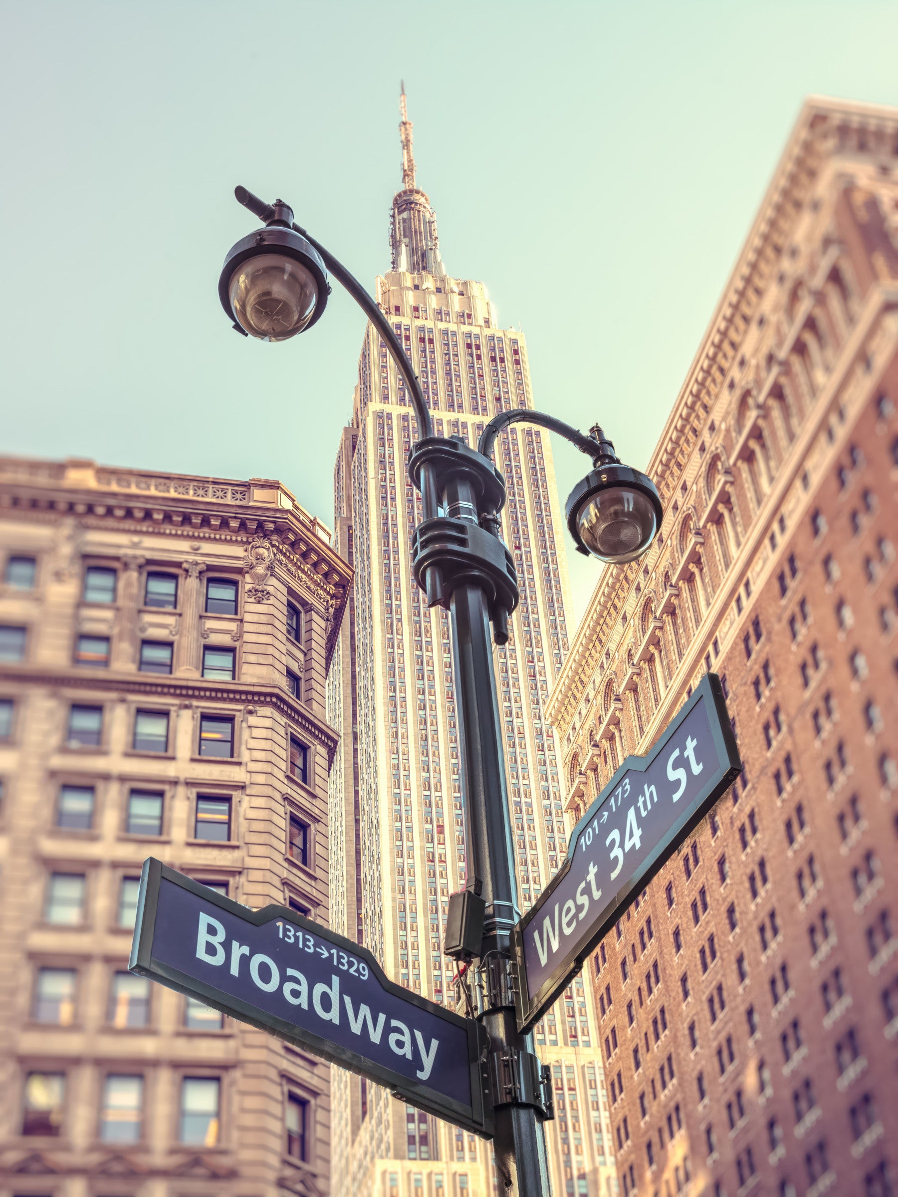 Street lamp and street signs with the Empire State Building in the background - New York. Elevate your space with this striking image of the Empire State Building, nestled among classic New York City architecture. This wallpaper captures a unique blend of old and new, showcasing the city's enduring appeal. Consider this wallpaper for walls to transform your space. The warm hues create a welcoming atmosphere, suited to living rooms, bedrooms, or office settings. Let this design create a city view, adding depth and character to complement interiors with contemporary flair.
