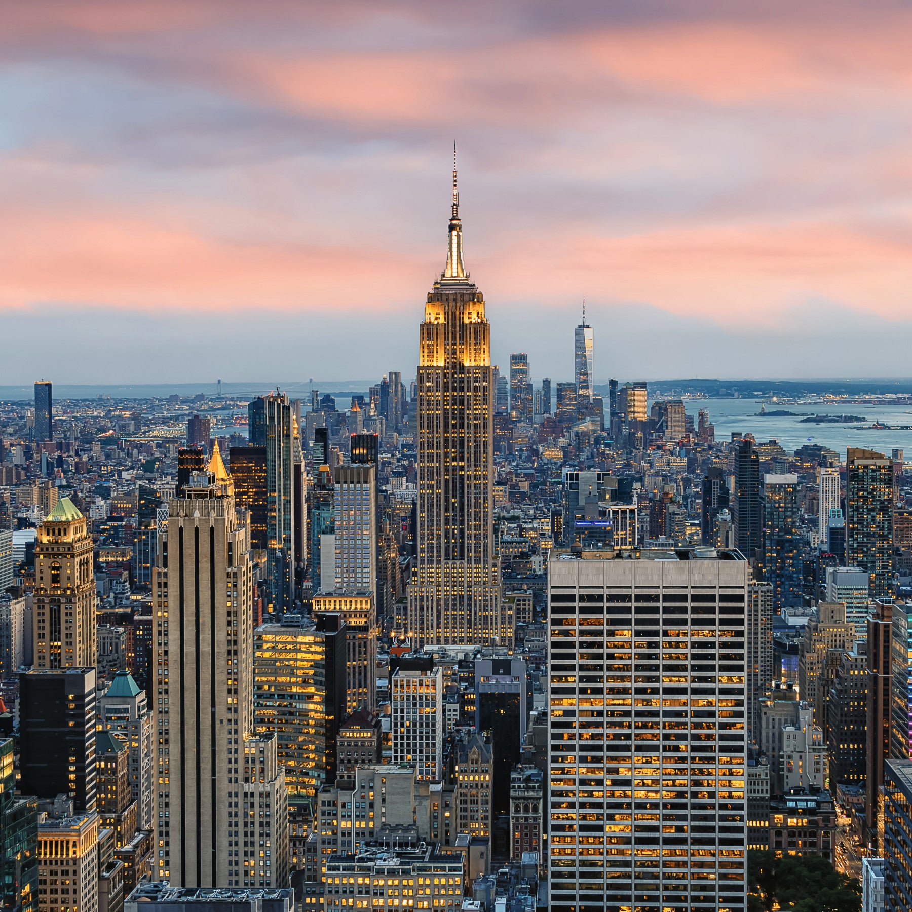 Experience the magic of Manhattan at sunset with this breathtaking wallpaper. The iconic Empire State Building stands tall against a vibrant, pastel sky, its lights twinkling as the city below comes alive. A multitude of skyscrapers stretch out towards the horizon, creating a stunning urban landscape bathed in the warm glow of the setting sun. The overall mood is serene yet energetic, capturing the captivating beauty and dynamic energy of New York City at twilight.
