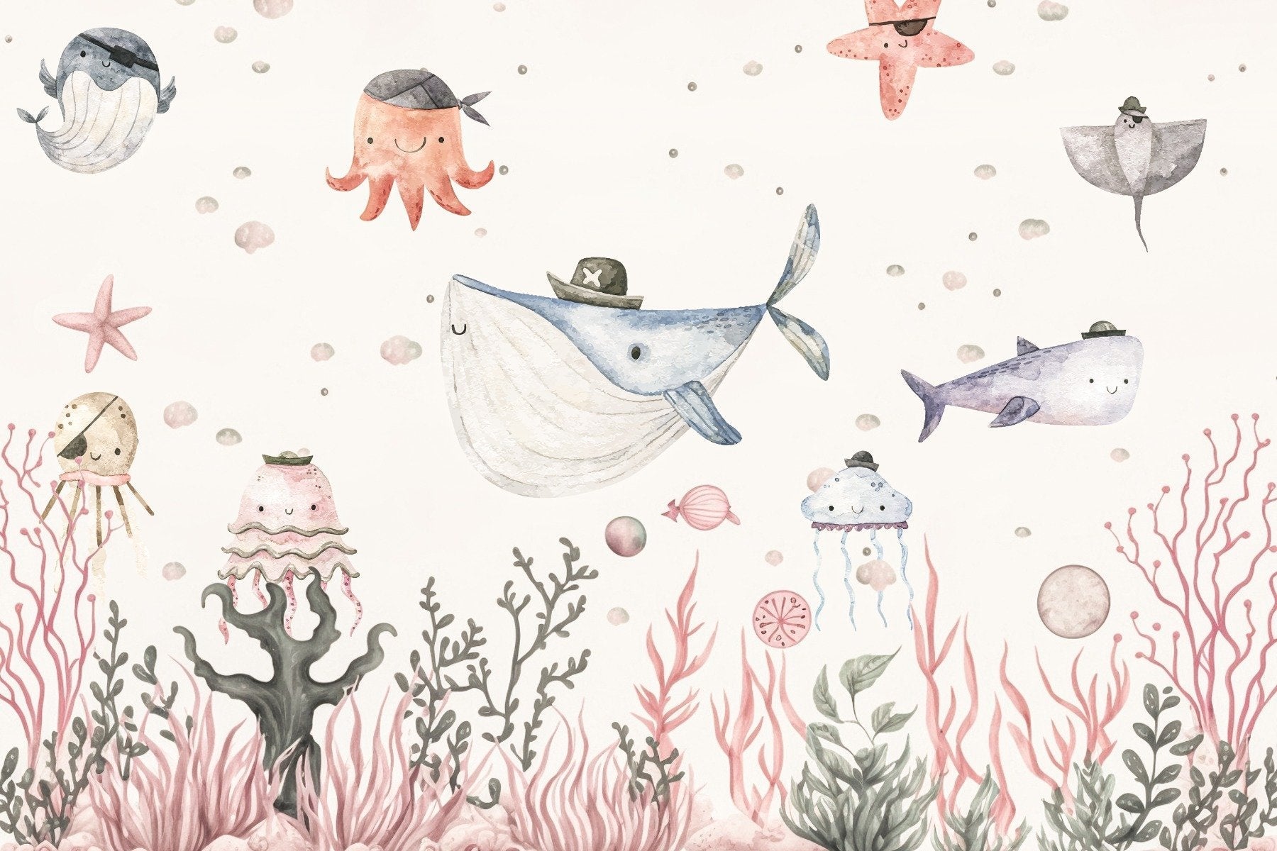 Dive into the depths of imagination with the maritime mischief aquarium mural, where the ocean's most charming characters come to life. This playful mural is a splash of fun for any playroom wallpaper, inviting young minds to explore and befriend the sea's hidden treasures. From the gentle whale donning a captain's hat to the smiling squid wearing a pirate's patch, each creature adds a dash of mischief to the underwater scene. Crafted with a palette of soft, oceanic hues, this ocean wallpaper is an underwater escapade, perfect for igniting stories of high-seas adventures. It's where every glance reveals a new friendly fin, creating a backdrop for play, learning, and endless marine discovery. Let the maritime mischief aquarium mural anchor your little one's playroom with a wave of wonder, fostering a playful environment where sea-inspired tales and giggles are always afoot.