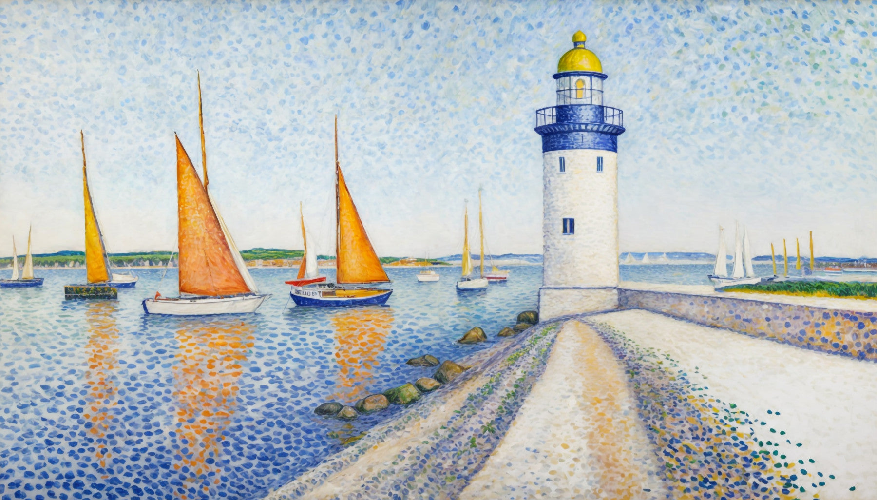 Transform your space with this captivating coastal wallpaper. The design features sailboats gliding on water beside a classic lighthouse, rendered in a stunning Pointillist style. Small dots of color create movement and depth, bringing the scene to life. This wallpaper for walls will add a touch of elegance to dining rooms, hallways, or home offices. Soft blues, yellows, and whites blend to create a soothing and sophisticated look that complements classic or contemporary décor.
