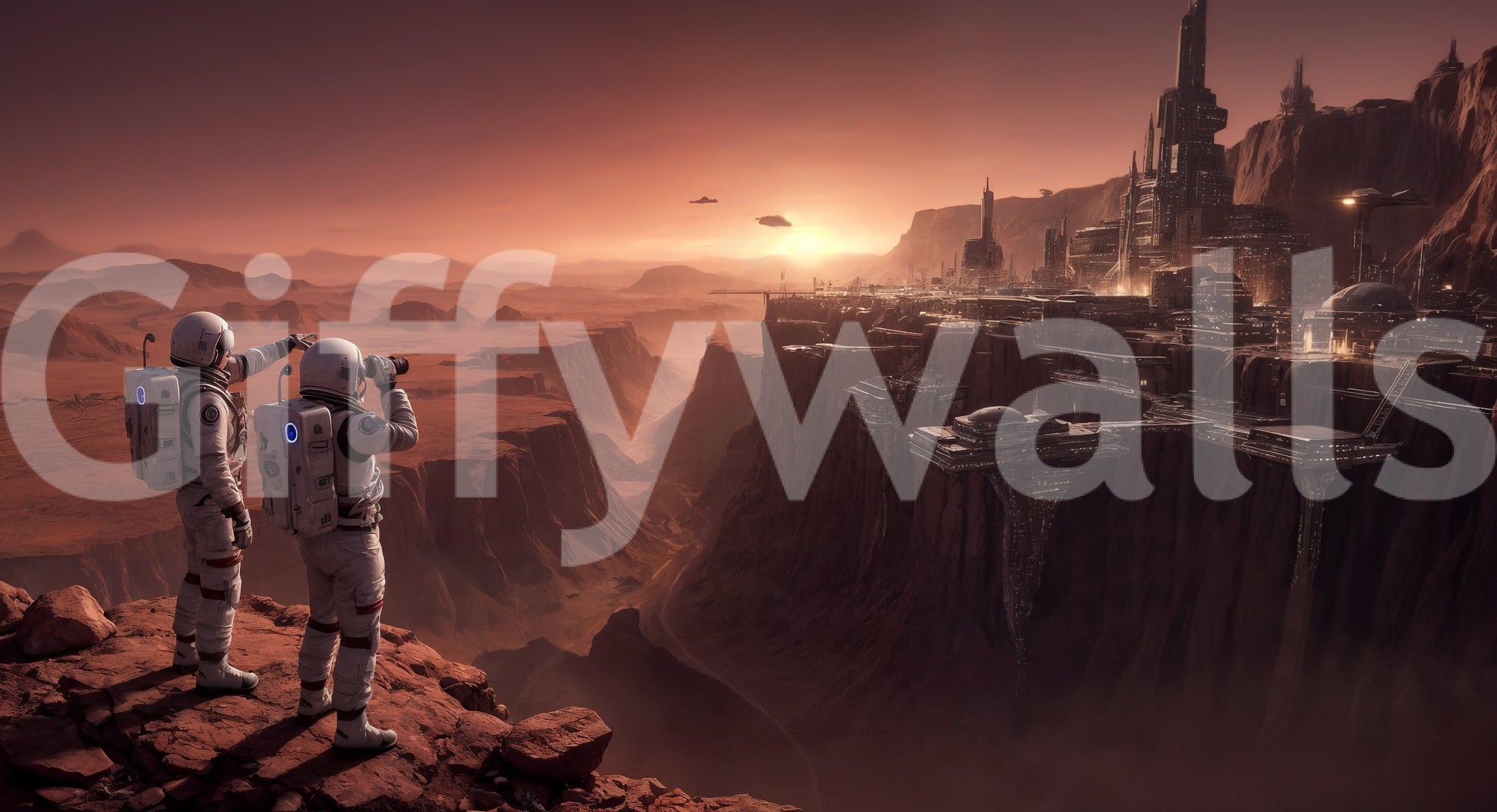 Venture to the red planet with this stunning wallpaper for walls, a captivating depiction of a future Martian settlement. The design features two astronauts surveying a futuristic city, rendered in warm, earthy tones of red, brown, and beige. This wallpaper evokes a sense of exploration and wonder, bringing a touch of science fiction to your décor. Ideal for living rooms, home offices, or bedrooms, the design creates an inspiring atmosphere. The detailed cityscape and vast Martian landscape add depth and visual interest, enhancing the overall aesthetic of your interior. Bring the cosmos home with this statement piece.