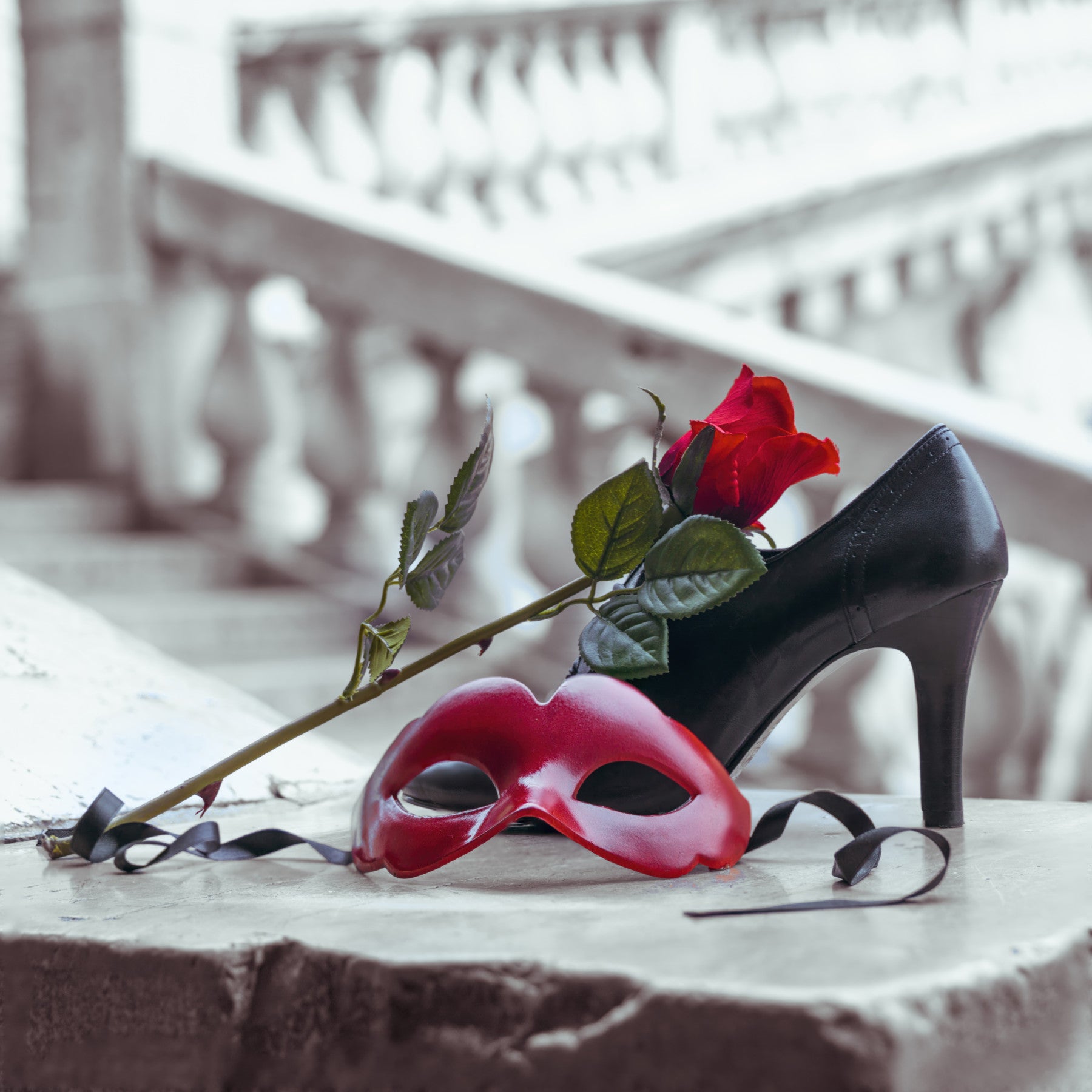 Venetian mask and high heel shoe with red rose, Rialto bridge, Venice, Italy. Elevate the sophistication of your interior spaces with this refined wallpaper for walls. The stylized composition presents a red rose, a classic stiletto, and a crimson mask, invoking intrigue. A dark ribbon adds drama against the backdrop. The muted, almost monochromatic, palette creates a timeless feel. This design integrates seamlessly into a dressing room, bedroom, or a chic hallway, complementing modern and classic aesthetics alike. Install it in a powder room to transform a small space. Consider this luxurious art piece to bring an air of mystery.