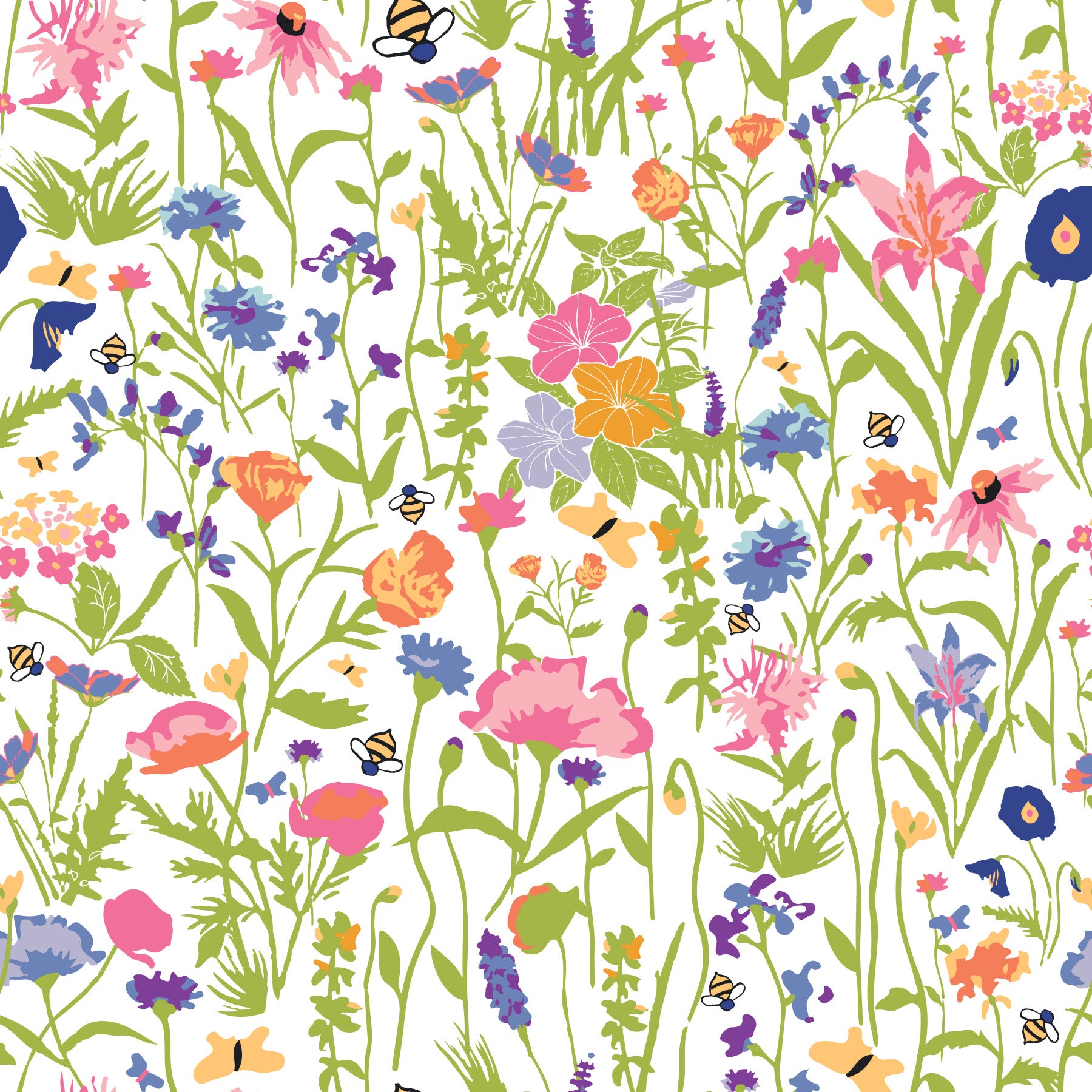 Bring a touch of spring to your home with this vibrant floral pattern. Colorful blossoms mingle with buzzing bees, creating a lively and cheerful design. The playful combination of pink, blue, orange, and green hues gives a fresh feel to any room. This wallpaper for walls works perfectly in a living room, bedroom, or nursery. The bright white backdrop allows the colors to pop, complementing a wide range of interior styles from modern to boho.
