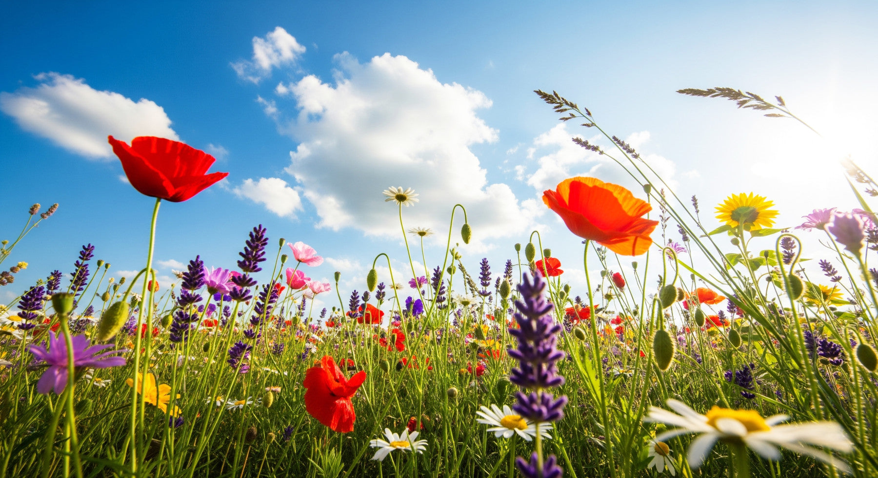 Bring the beauty of a sun-drenched field into your home with this stunning wallpaper for walls. Colorful wildflowers dance against a backdrop of blue sky and fluffy clouds, creating a sense of peace and tranquility. This design features a vibrant mix of poppies, daisies, and lavender, perfect for brightening up any room. Let this vibrant scene complement interiors like bedrooms, living rooms, or a home office, bringing nature's beauty indoors.