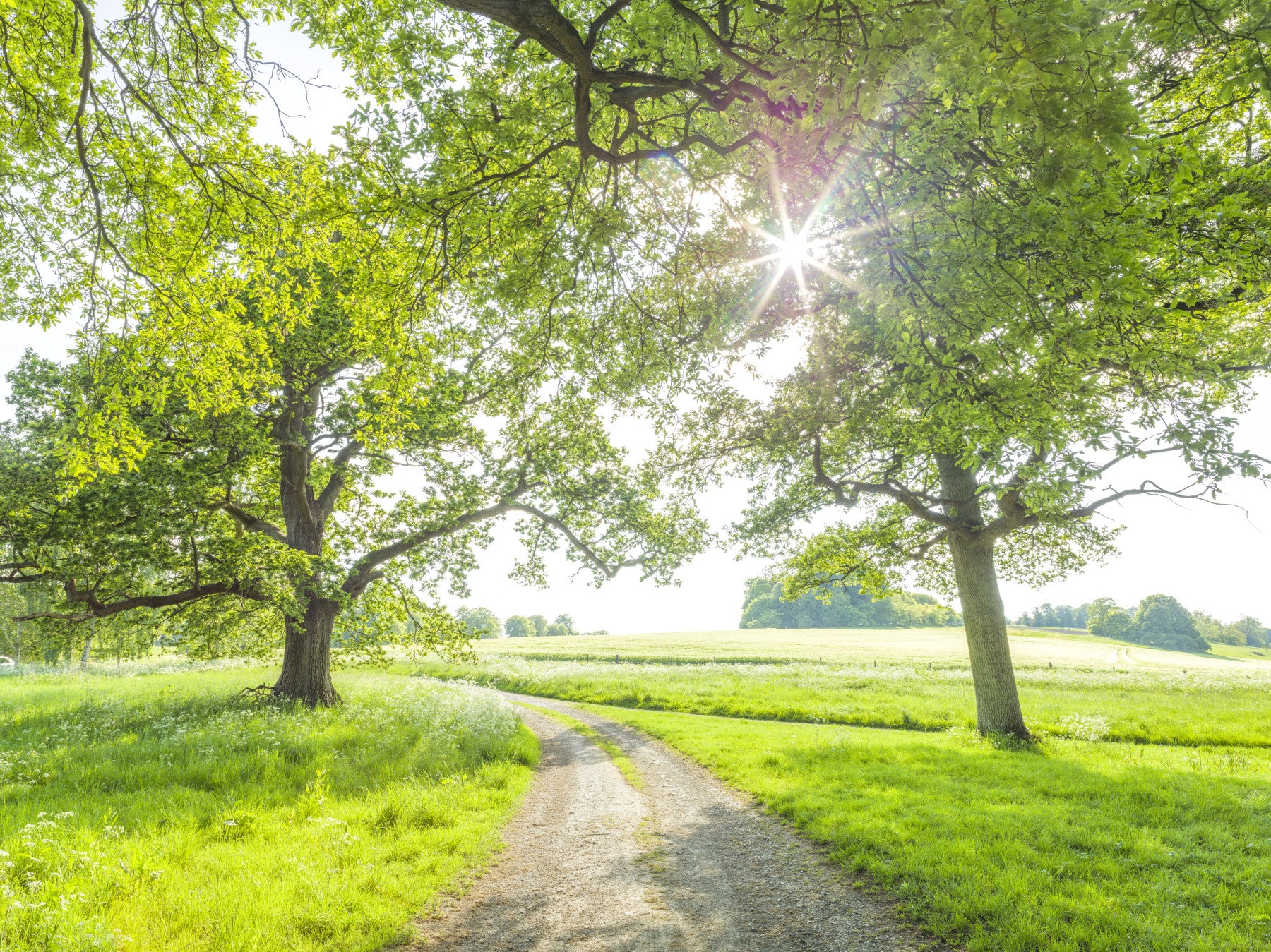 Pathway through grassfield in countryside. Transform any room into a serene escape with this idyllic wallpaper. The scene captures a sun-kissed meadow path framed by mature trees, their branches laden with vibrant green leaves. The design features a balance of light and shadow, creating a tranquil atmosphere. Choose this wallpaper for walls to complement spaces where you wish to establish an atmosphere of calmness. This backdrop is perfect for bedrooms, living rooms, and hallways, and the design brings a touch of nature indoors, softening modern interiors with its verdant tones.