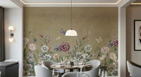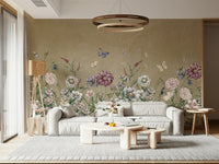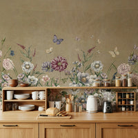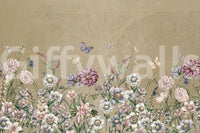 Transform any room with this refined floral scene. The muted color palette of beige, soft pink, and lavender creates a tranquil atmosphere. Fluttering butterflies add a whimsical touch to the stylized blooms. Consider this wallpaper for walls in a bedroom or dining room for a touch of elegance. Its subtle pattern complements natural materials and delicate furnishings, creating a peaceful retreat within your home. Embrace the beauty of a blooming meadow with this design.