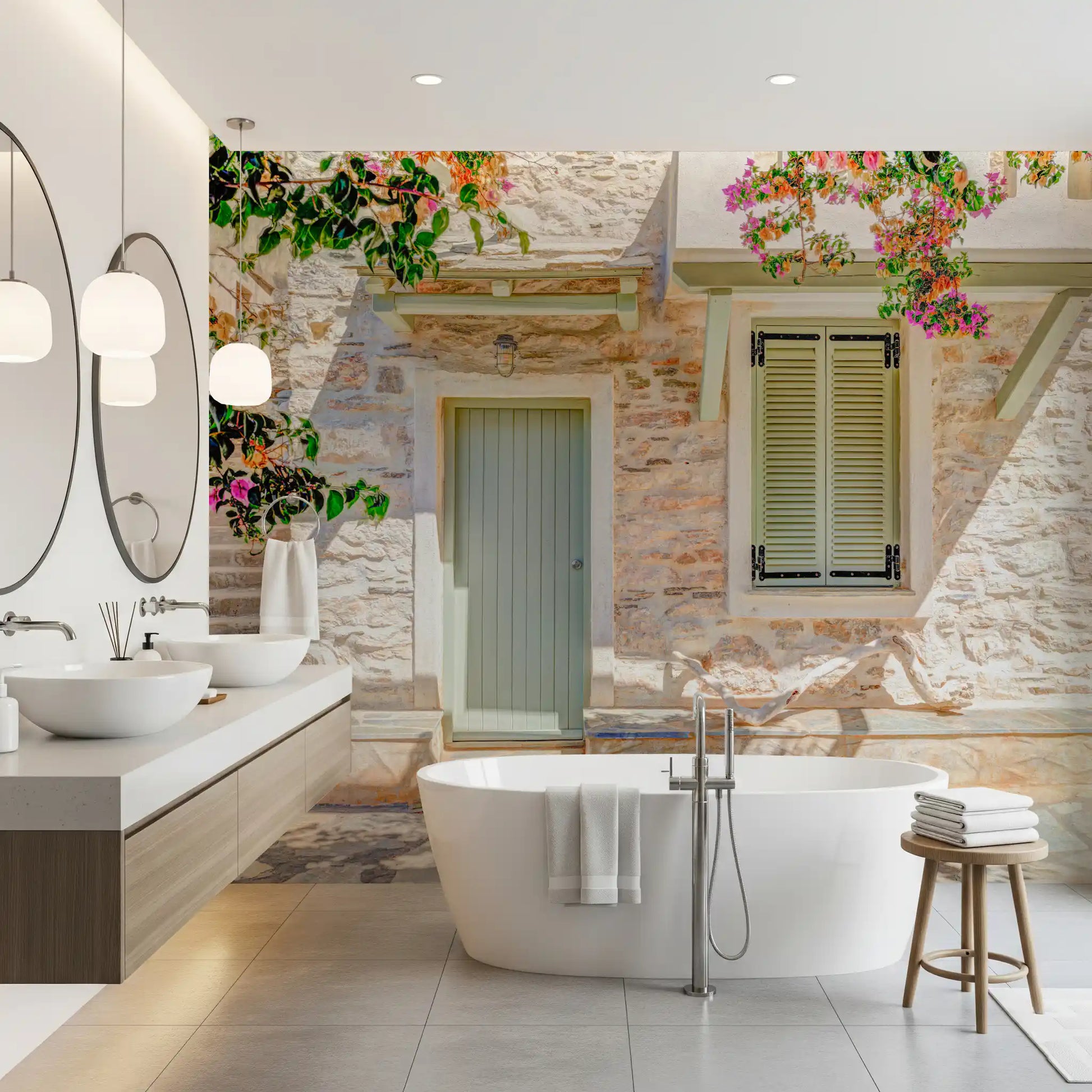 Transport yourself to a sun-drenched Mediterranean paradise with this captivating wall décor. The image presents a charming stone facade, complete with a pale green door and shuttered window, evoking a sense of tranquility and timeless beauty. Vibrant bougainvillea cascades over the architecture, adding pops of color and a touch of whimsical romance. The rough texture of the stone wall contrasts beautifully with the smooth, painted wood, creating visual interest and depth. Bask in the warmth and inviting atmosphere of this Mediterranean vista, perfect for adding a touch of European elegance and relaxed sophistication to any room.