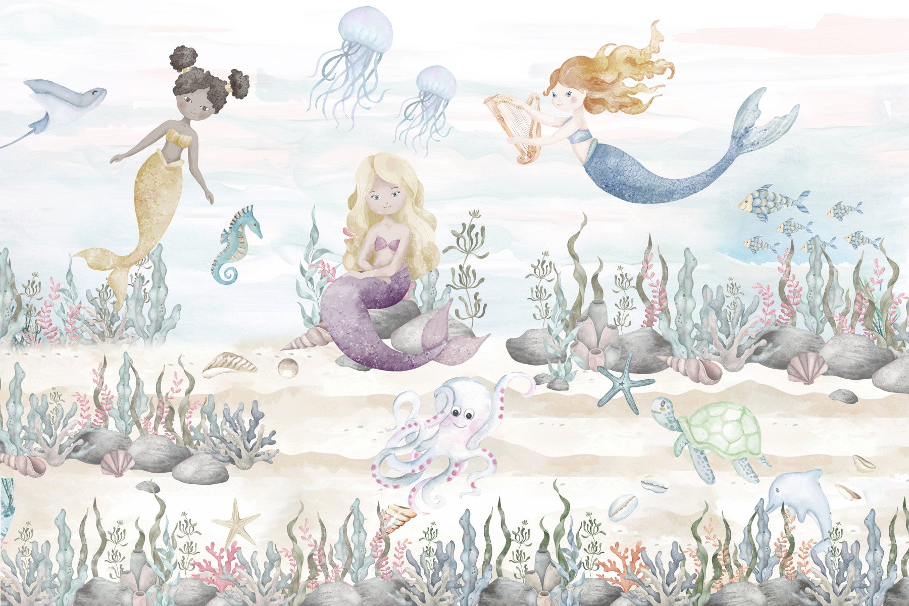 Dive into an underwater fantasy with this whimsical mermaid scene. Charming mermaids, jellyfish, and seahorses float amidst coral and seaweed. The soft watercolor style and gentle color palette creates a calming ambiance. Perfect as wallpaper for walls in a nursery, kids' room, or bathroom, this design sparks imagination. The playful pattern complements interiors with its blend of dreamy colors and marine life.