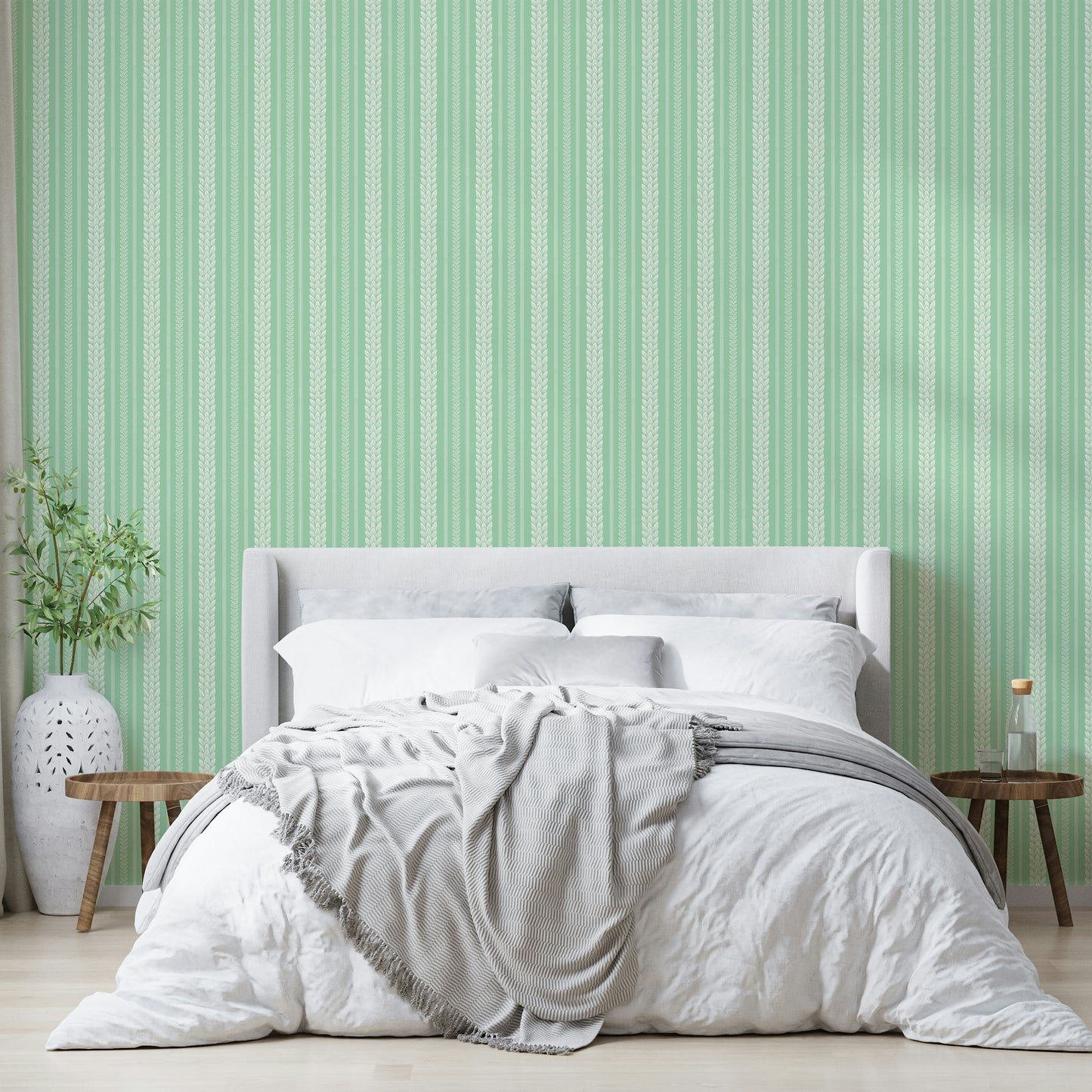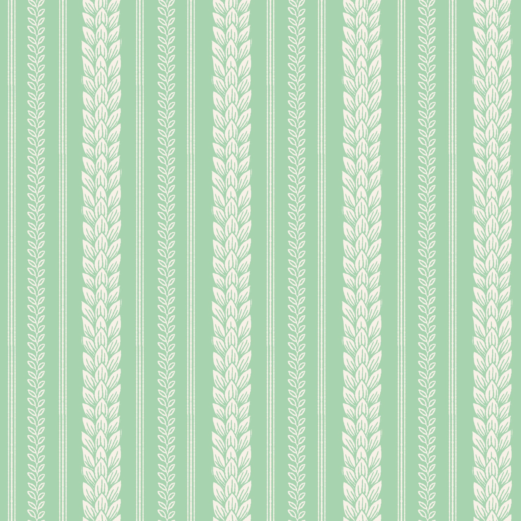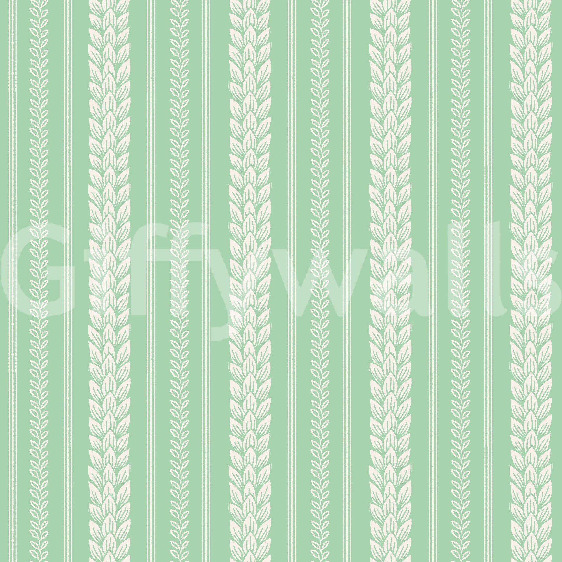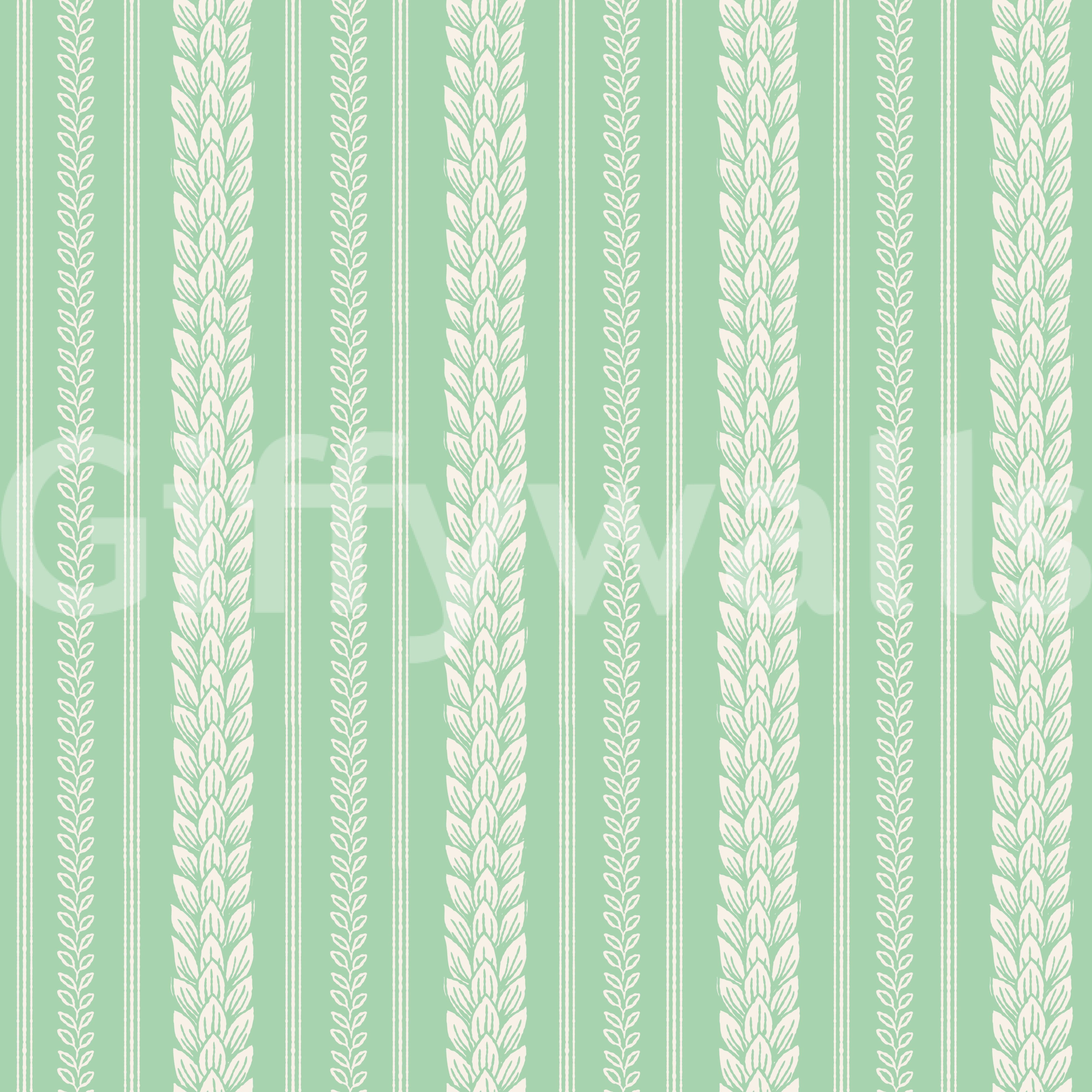 Embrace cheerful spring vibes with this "Merry Cherry Green Stripe" wallpaper. The design features elegant, off-white leaf motifs arranged in vertical stripes against a refreshing pale green backdrop. The repeating pattern of stylized leaves creates a sense of playful sophistication, perfect for adding a touch of natural charm to any space. Thin green stripes subtly separate the leaf columns, enhancing the overall visual rhythm and creating a balanced, harmonious aesthetic. This wallpaper is a delightful blend of classic and contemporary, bringing a fresh, optimistic feeling to your home or office.