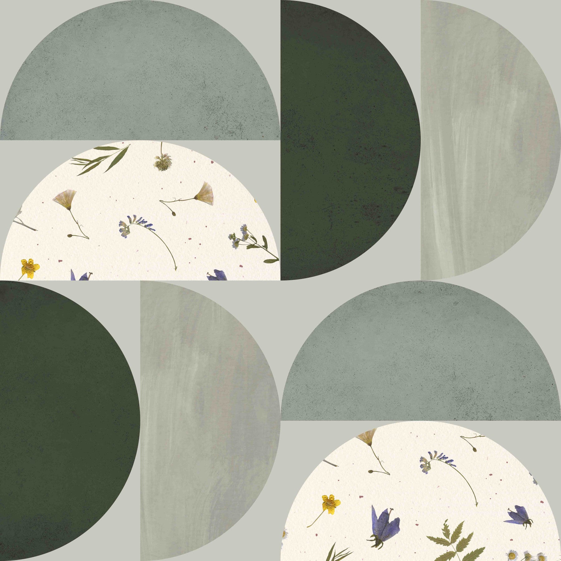 Mescolanza 18 is a harmonious blend of natural and abstract elements, resulting in a visually captivating wallpaper. Earthy tones of sage green, deep forest, and subtle greys intertwine with delicate floral motifs, creating a sense of understated elegance. The geometric arrangement of semi-circles offers a modern, structured contrast to the organic details of pressed flowers and textured backgrounds. This design balances rustic charm with contemporary aesthetics, making it a perfect choice for adding a touch of sophisticated tranquility to any digital space.