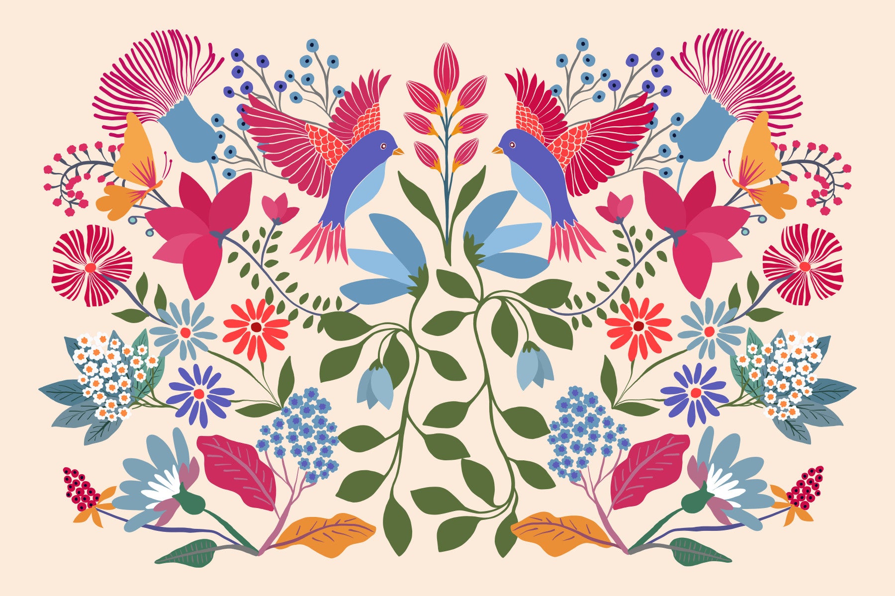 Invite the vibrant spirit of Mexico into your space with this captivating wall décor. "Mexican Garden" bursts with the warmth and cheer of a sun-drenched hacienda, rendered in a stylized, folk-art aesthetic. Symmetrical arrangements of stylized flora in a kaleidoscope of color – deep reds, tranquil blues, and sunny yellows – bloom against a soft, neutral backdrop. Flitting butterflies and stylized birds with crimson wings add a touch of whimsy and movement. This design evokes the artistry of traditional Mexican textiles. This piece is ideal for adding a touch of joyful elegance to any room, transforming your walls into a canvas that celebrates the beauty and culture of Mexico. Transform your space into a vibrant and inviting sanctuary, echoing the rich traditions of Mexican art.