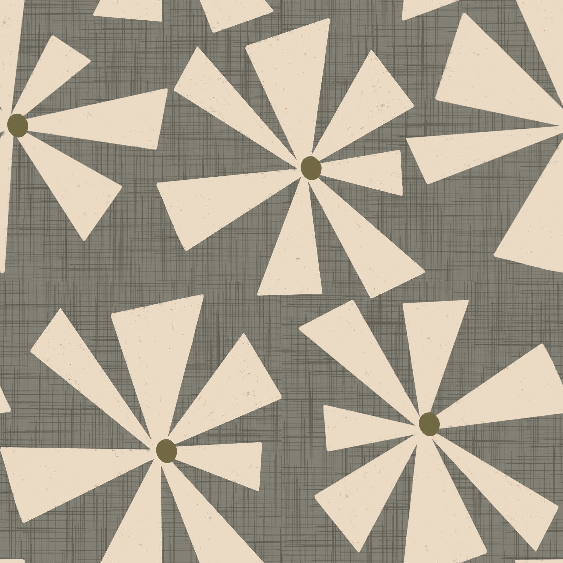Transform your living space with this charming mid-century modern floral design. The stylized blooms feature ivory petals and an olive-green center, set against a textured gray backdrop. The abstract pattern brings a touch of vintage sophistication to any room. This wallpaper for walls suits living rooms, bedrooms, or home offices, creating a calm and inviting environment. Its neutral palette complements a variety of interior styles, from minimalist to bohemian.
