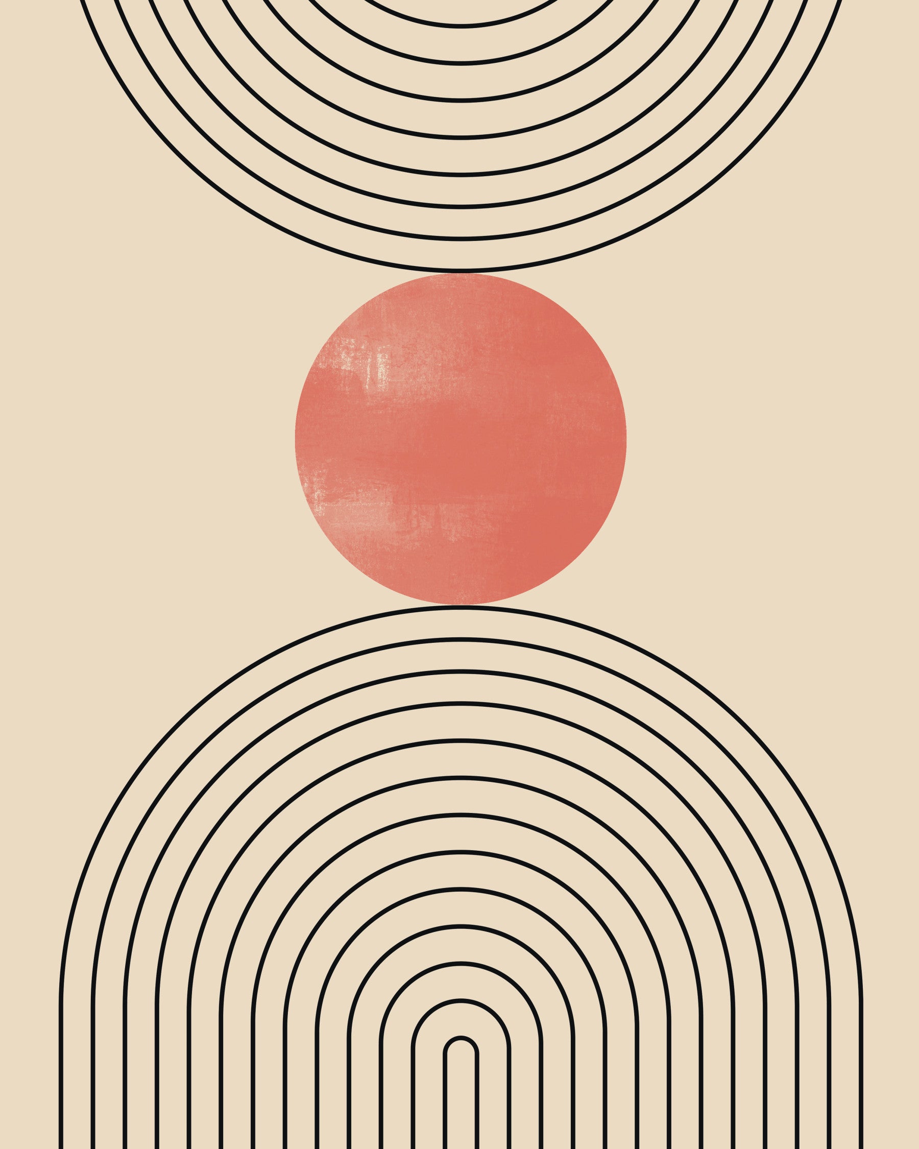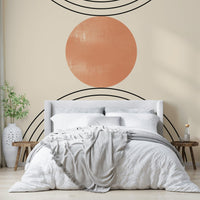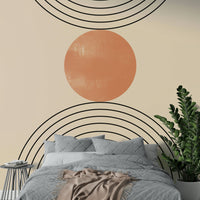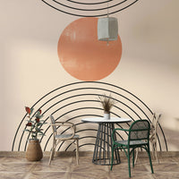 This wallpaper embodies the essence of mid-century modern design with its clean lines, geometric shapes, and muted color palette. The interplay of black lines, a warm beige background, and a textured terracotta circle creates a visually captivating and calming effect. The simple yet sophisticated design makes it a versatile choice for any room, from living rooms and bedrooms to offices and hallways, adding a touch of understated elegance to your space. Its minimalist aesthetic promotes a sense of tranquility and order, perfect for those seeking a serene and stylish atmosphere.