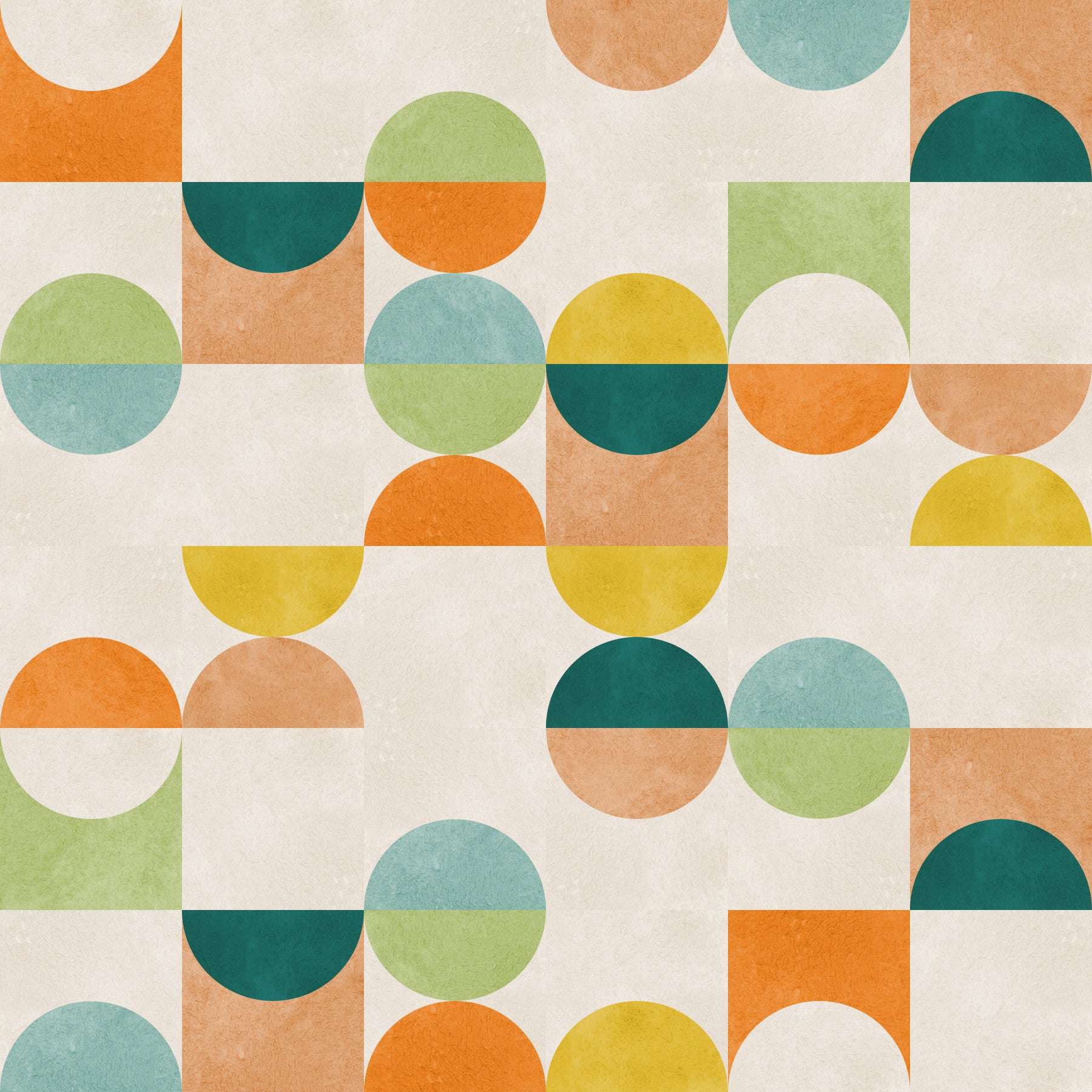 Dive into the retro charm of this mid-century modern pattern. Circles, semicircles, and squares interlock in a playful arrangement of orange, teal, yellow, and green. With a textured surface that adds depth and interest, this wallpaper for walls brings a pop of color and a dose of vintage flair. Ideal for adding a touch of fun to kids' rooms, playrooms, or even a creative home office, the design is easy to install and coordinates with various interior styles. Enjoy a stylish, retro vibe in any room.