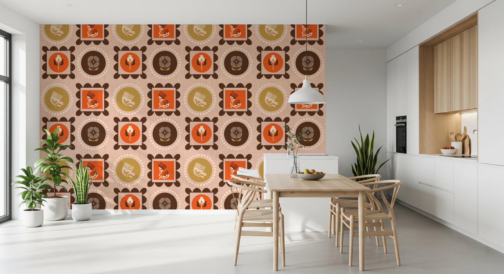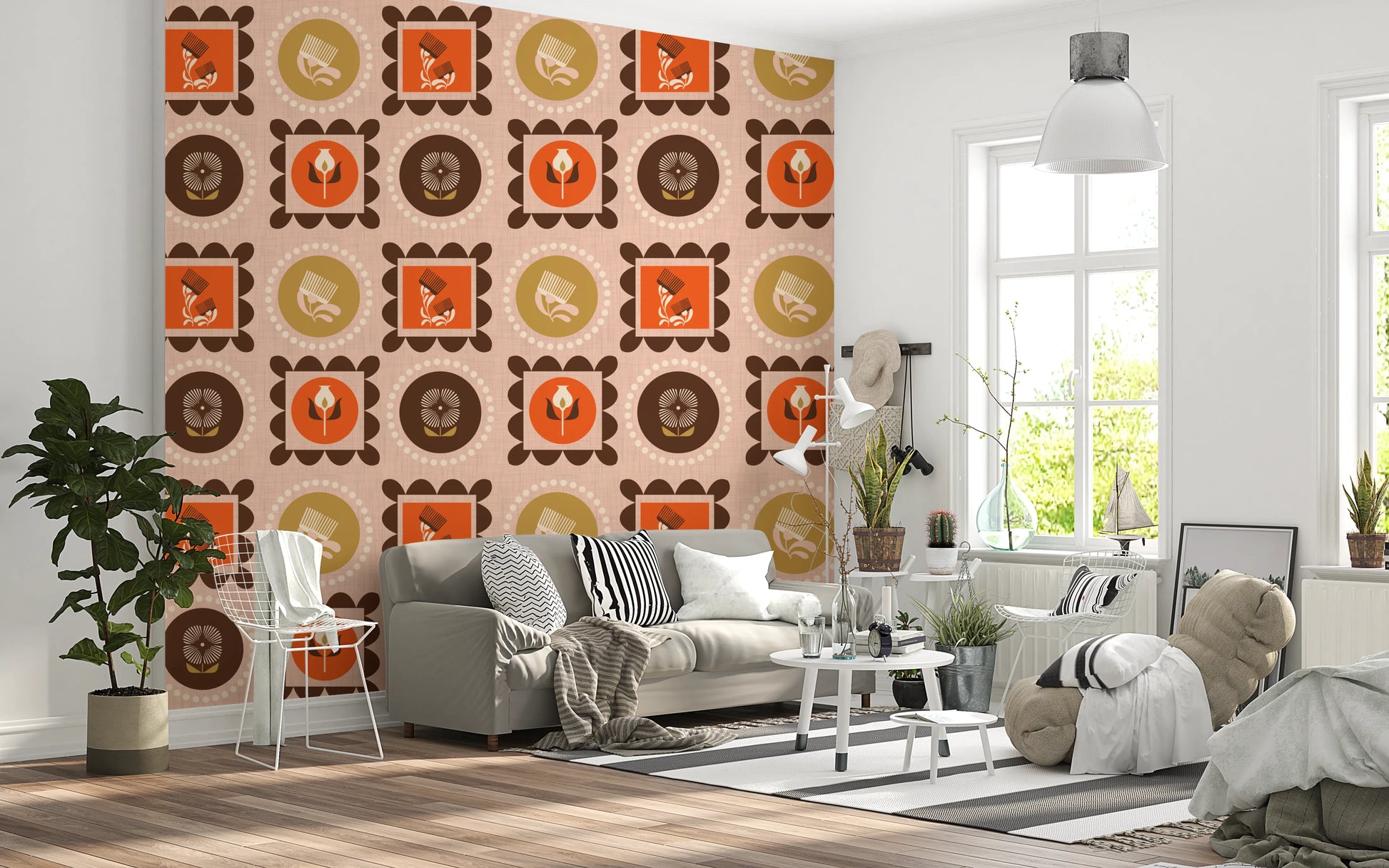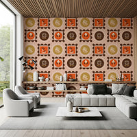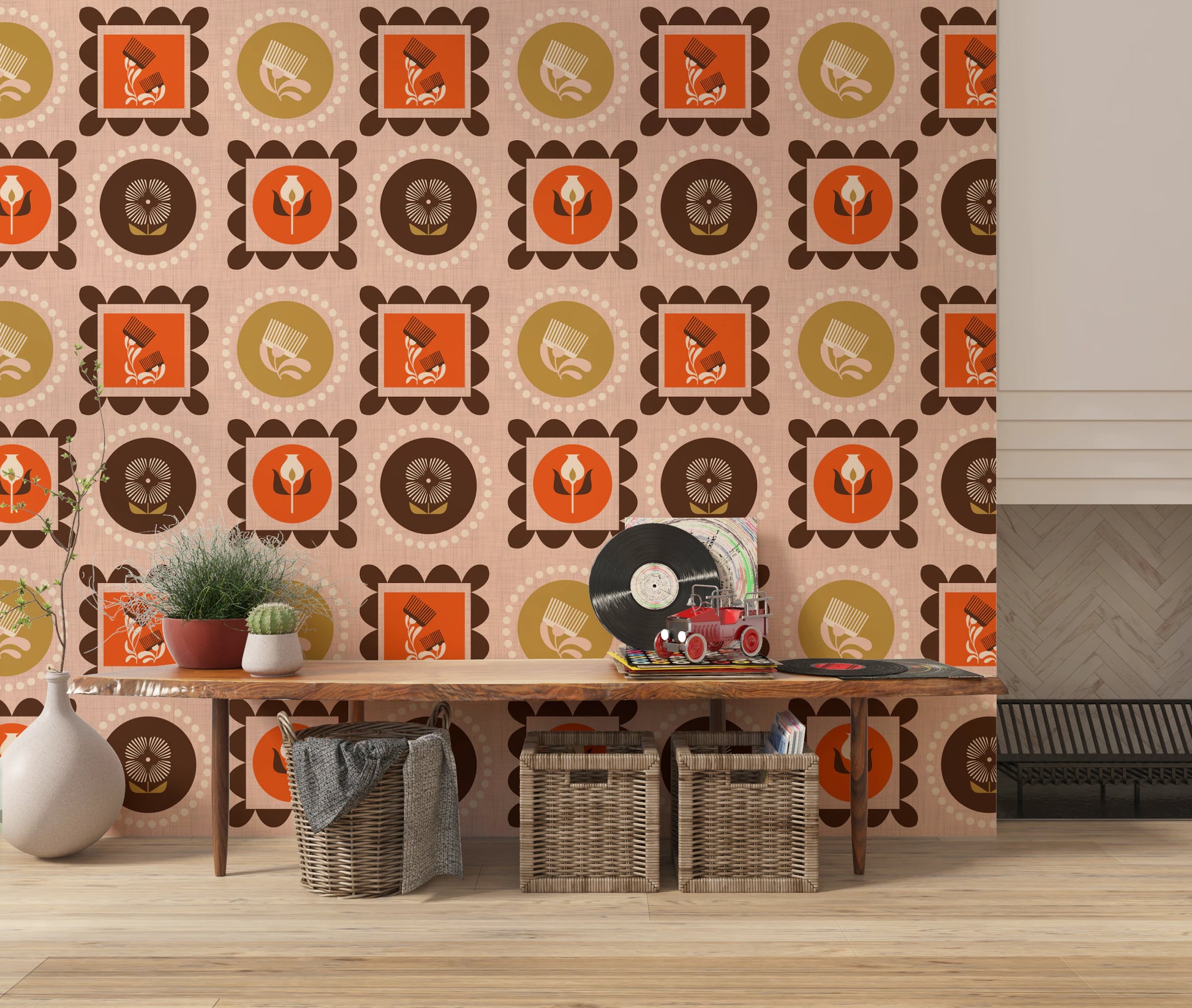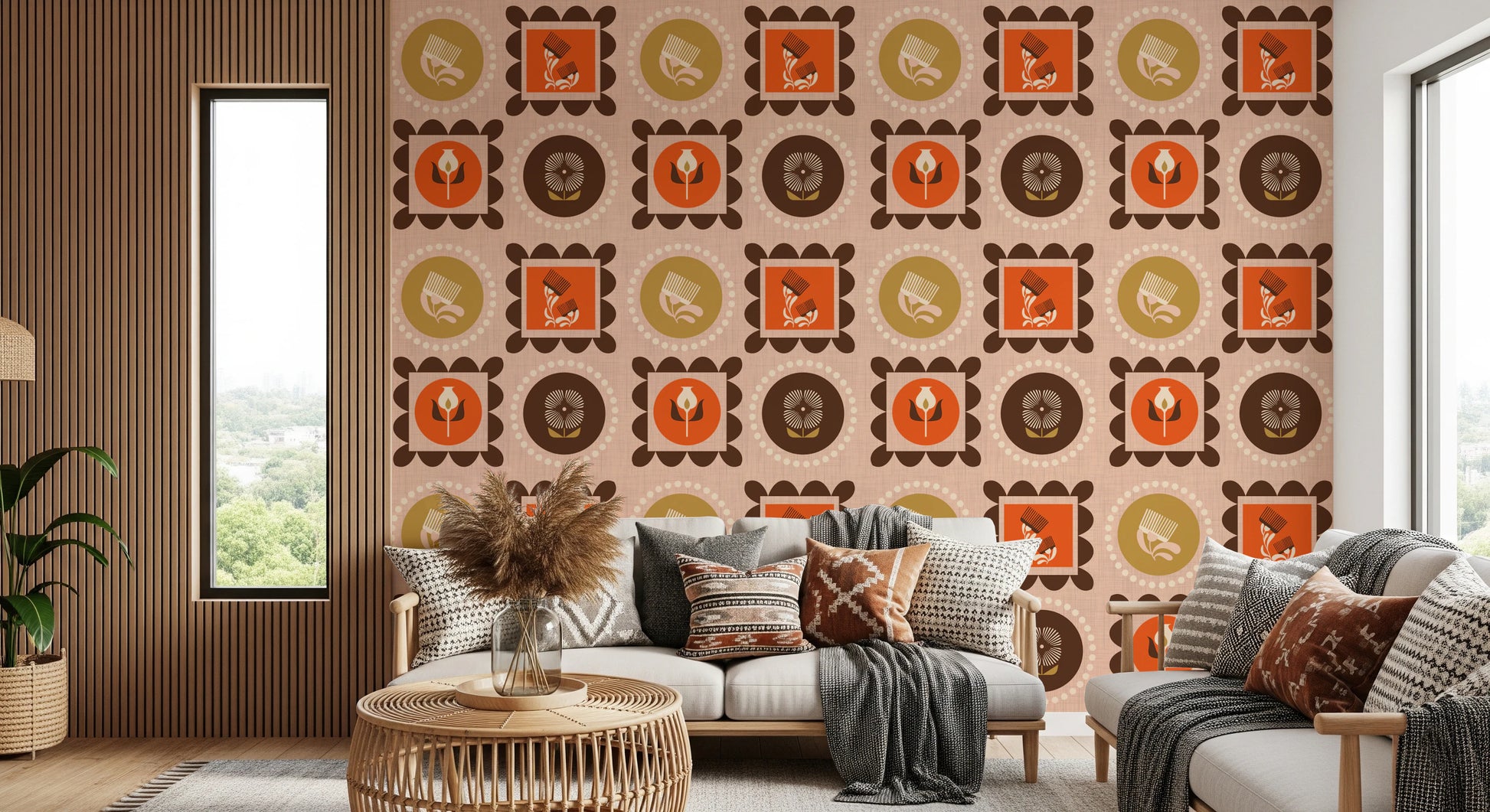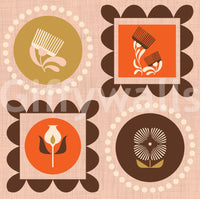 Transform your space with the retro charm of 'Mid Mod Wildflower Frames.' This captivating design features a botanical collage, carefully arranged within geometric frames, evoking a warm and inviting atmosphere. Ocher and terracotta hues dominate, creating a rich and earthy palette that complements any interior. Stylized wildflower motifs, presented in a simplified, graphic form, bring a touch of nature indoors, while the mid-century modern aesthetic adds a sophisticated edge. The balanced composition and pleasing color scheme makes it a perfect choice for creating a focal point in any room, lending a touch of vintage elegance and timeless style to your walls. Elevate your interior with this statement piece.
