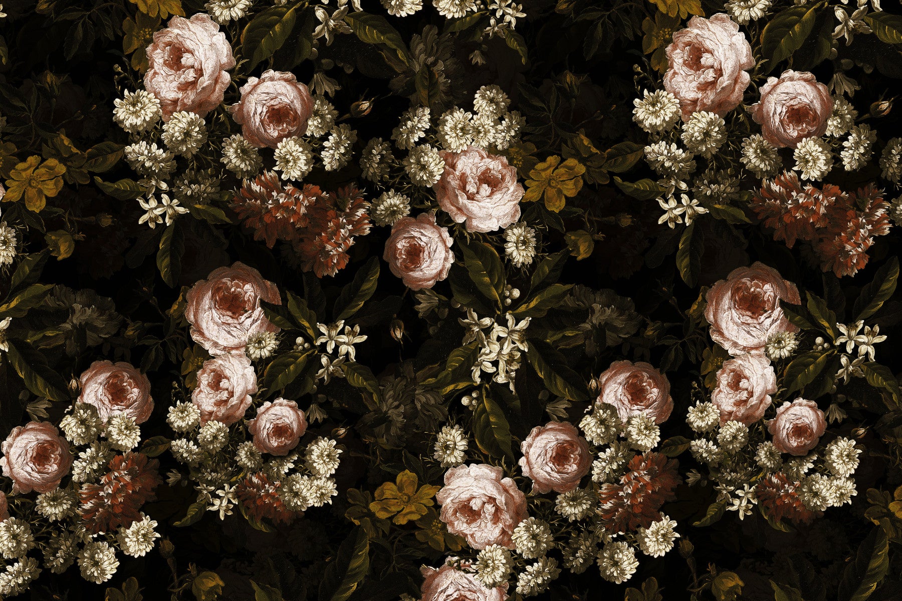 A dramatic baroque bloom wallpaper mural that defines a space.