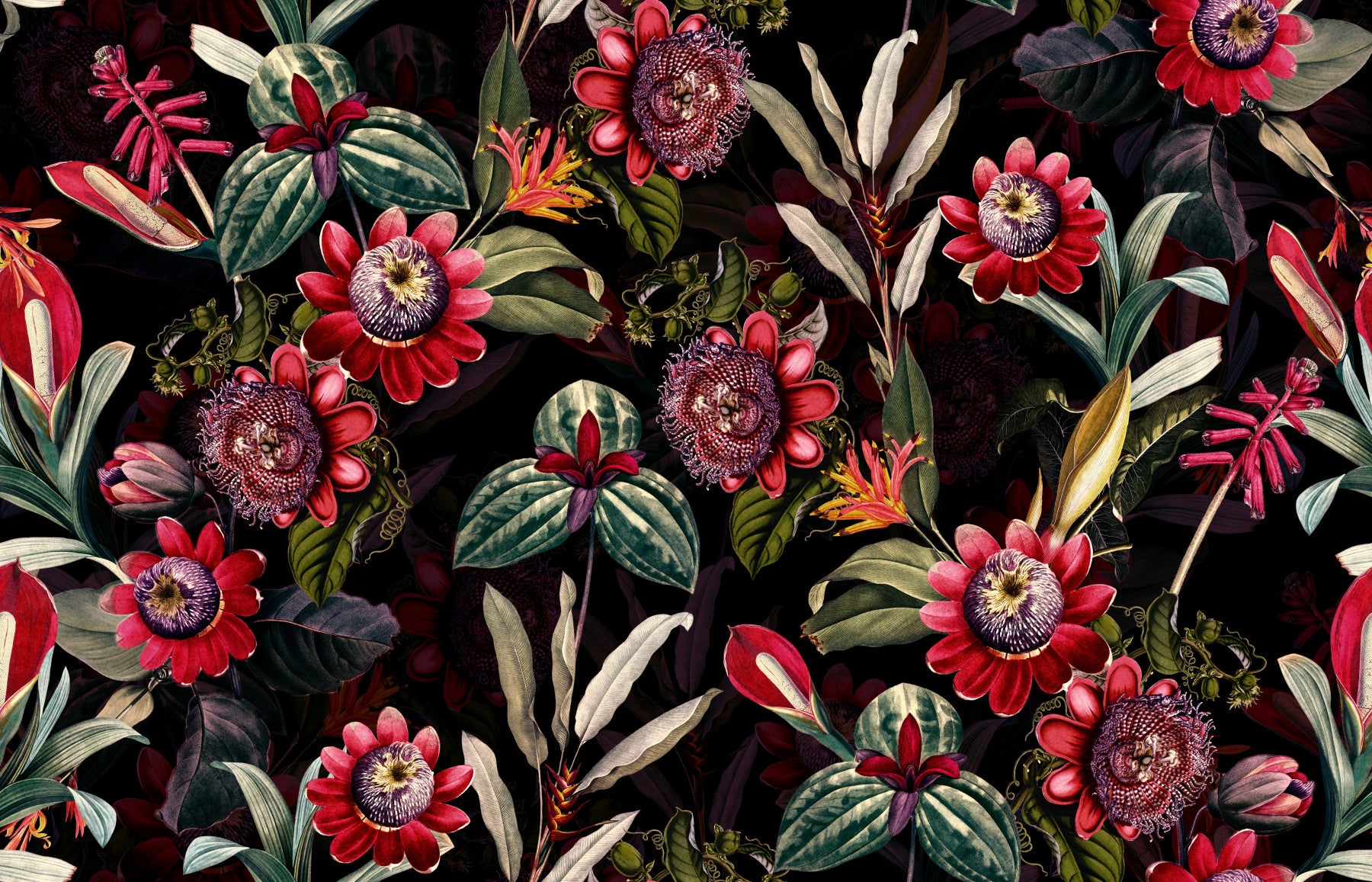 Indulge in the captivating allure of 'Midnight Bloom,' a wallpaper design that transports you to a lush, nocturnal garden. Intricate botanical illustrations of crimson passionflowers and exotic foliage unfurl against a deep black backdrop. The rich jewel tones of deep reds, emerald greens, and hints of burgundy create a sophisticated and darkly romantic atmosphere. This wallpaper is perfect for adding a touch of exotic elegance and mystery to any space, whether it's a bedroom, living room, or even a dramatic entryway. The detailed artwork offers a mesmerizing visual experience, drawing the eye into a world of vibrant yet subdued natural beauty.