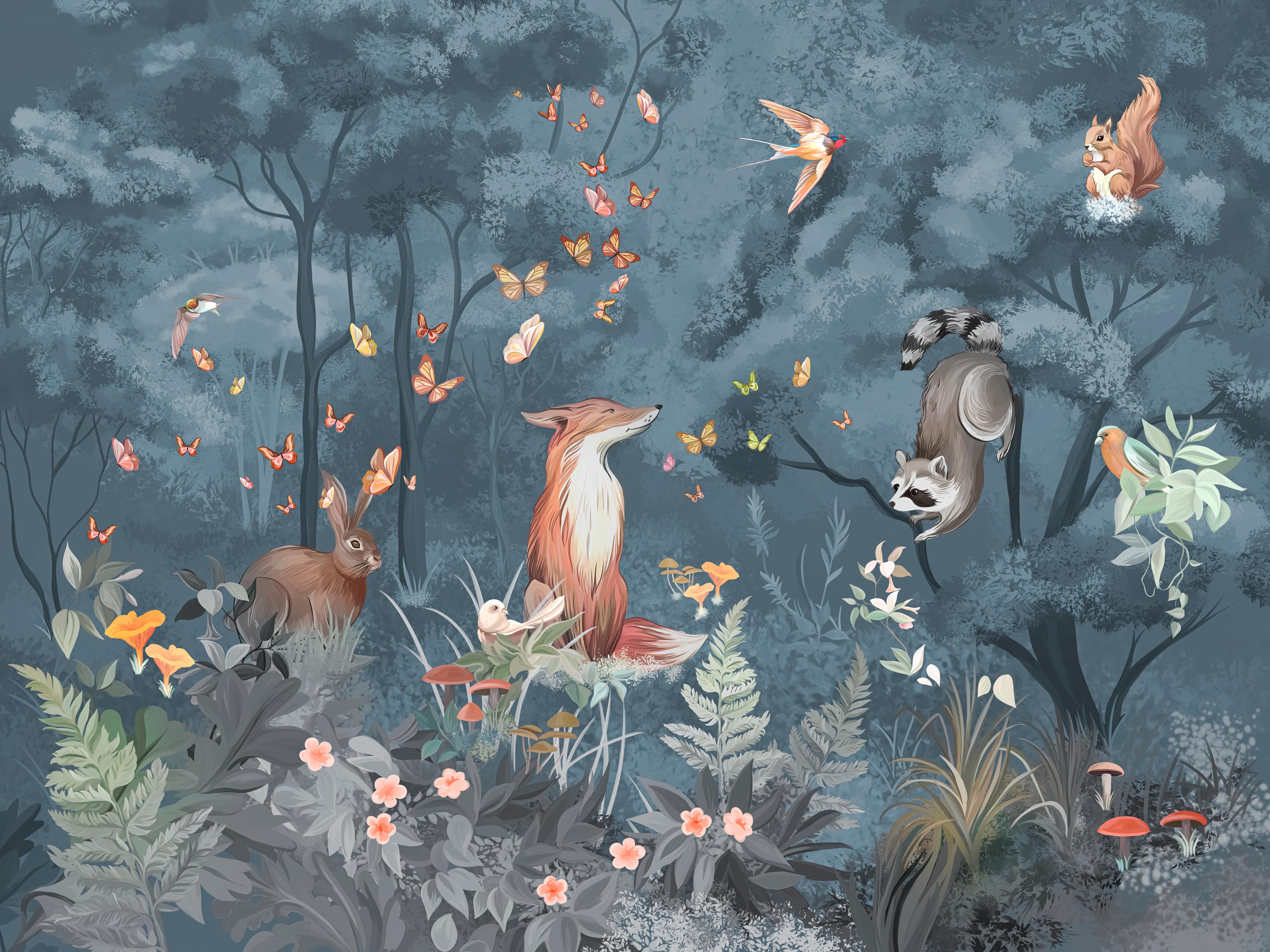 Transform your little one's space with Midnight Blue Forest Wallpaper, a dreamy nursery wallpaper featuring a magical woodland scene. Set against a deep blue backdrop, charming foxes, rabbits, raccoons, and squirrels bring warmth and wonder to any room. Delicate butterflies and lush foliage add a whimsical touch, making this design perfect for creating a calming and imaginative environment. Crafted with high-quality materials, this peel-and-stick wallpaper is easy to install and remove. Whether for a nursery, playroom, or cozy corner, this enchanting forest mural adds a serene and storybook-like charm, making it an ideal choice for nature-inspired interiors.