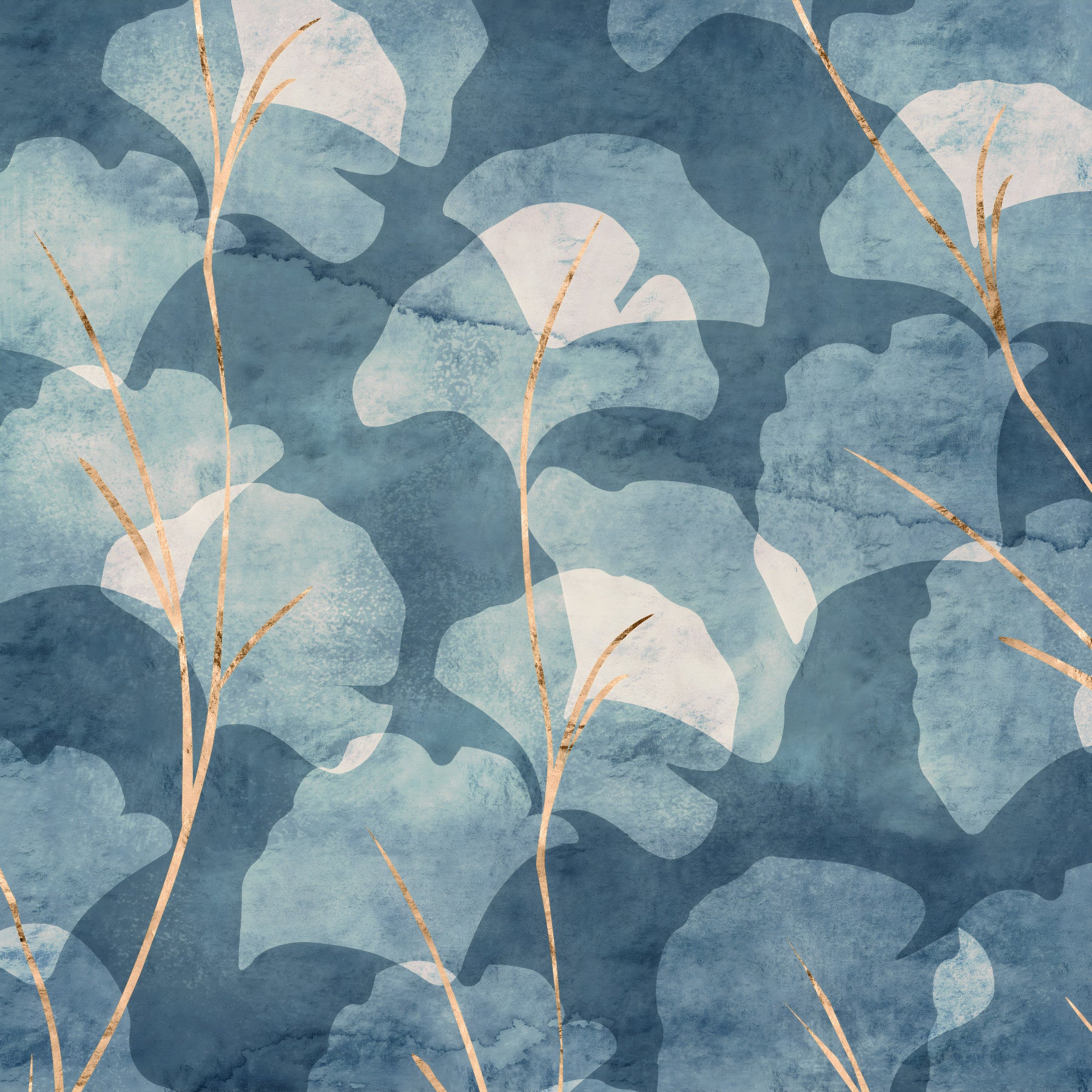 Textured blue ginkgo mural with elegant gold branch details