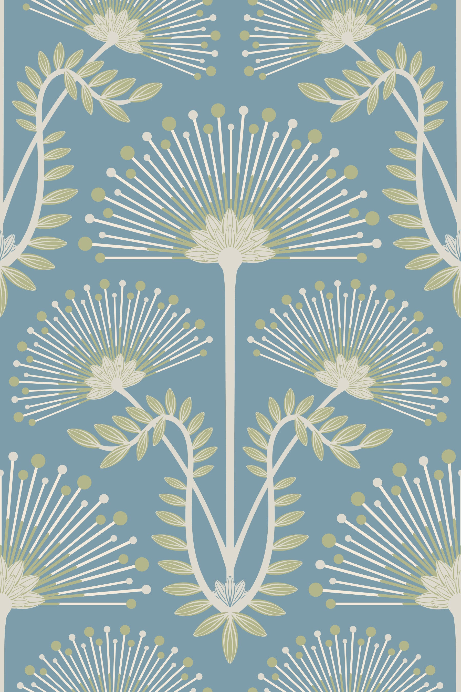 Evoke the elegance of the Roaring Twenties and the Jazz Age with this "Mimosa" floral wallpaper. This Art Deco-inspired design features a striking botanical damask pattern, blending symmetrical flower motifs with geometric precision in a palette of sage green, white and light gray on a light blue background. Graceful mimosa blooms with radiating details and organic curving foliage bring a touch of nature and a visual rhythm to this pattern. A sophisticated and timeless choice, "Mimosa" adds a touch of vintage glamour to any space while remaining contemporary and elegantly stylish. This pattern design is also available in Other Colourways too! Original wallpaper pattern design by Jackie Tahara of UnBlink Studio.