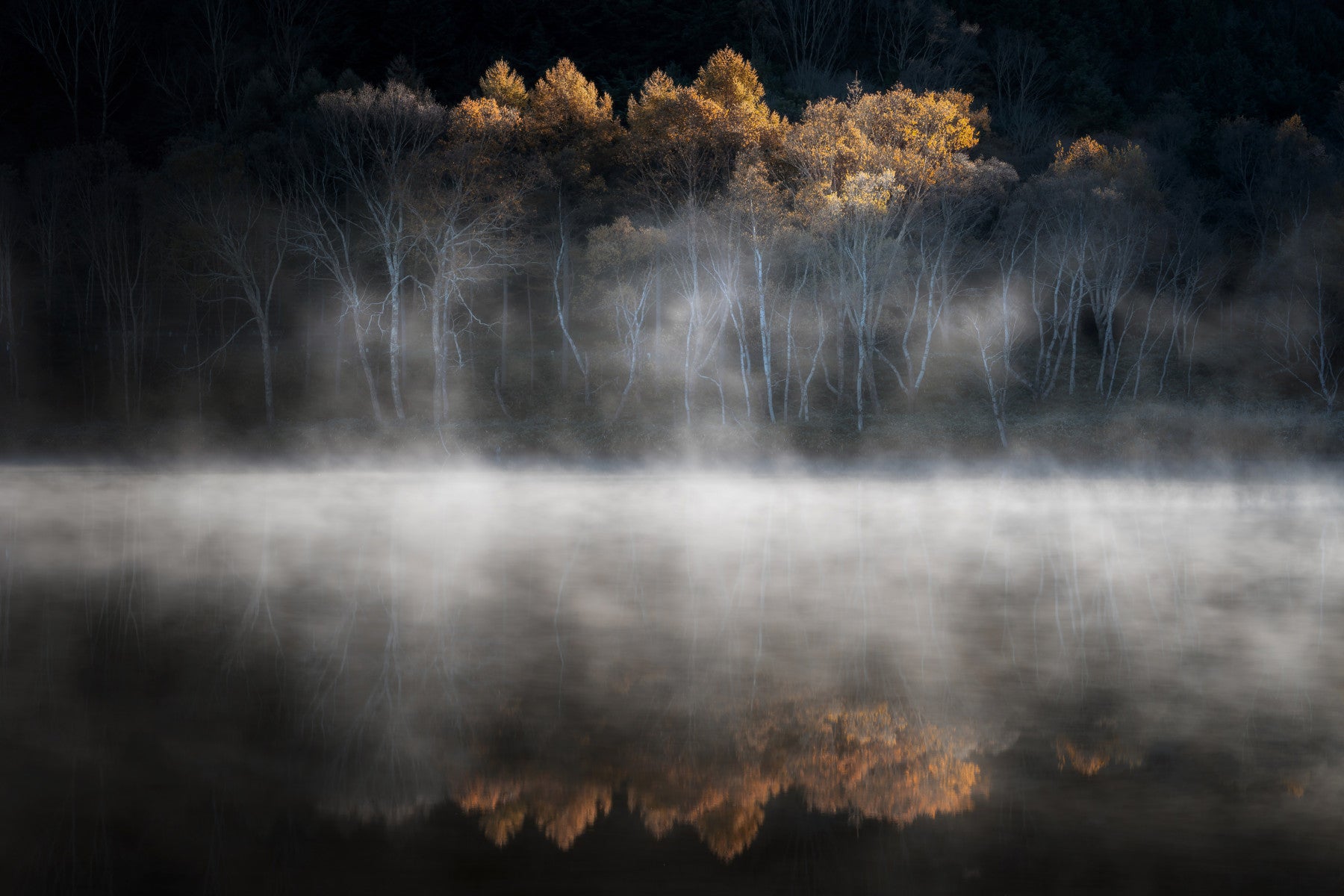Capture the magic of dawn with this captivating wallpaper. Witness a forest awaken, shrouded in mist and bathed in a gentle golden light. The mirror-like water reflects the scene, doubling the beauty. Consider this calming wallpaper for walls in your bedroom or office to inspire relaxation and creativity. The image's simple composition provides a touch of elegance and integrates easily with minimalist or rustic interiors, creating a cozy, nature-inspired atmosphere.