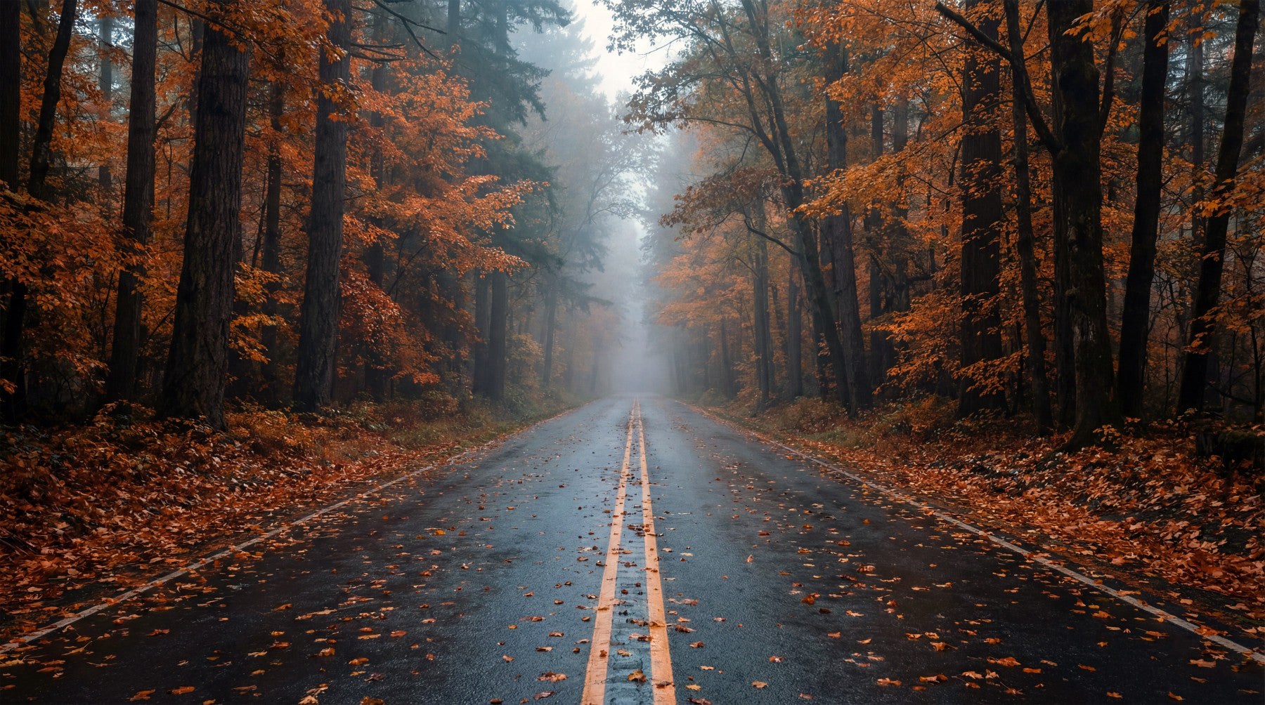 This captivating wallpaper for walls immerses your space in the tranquil beauty of an autumn forest. A glistening wet road, scattered with vibrant orange leaves, extends into a soft, ethereal mist, framed by majestic trees adorned in fall's rich hues. The design creates a compelling sense of depth and perspective, guiding the gaze into the mysterious fog. Dominant warm oranges and earthy browns define the color palette, balanced by the cool, reflective grays of the wet pavement and the soft, diffused whites of the mist. This atmospheric design thrives in a living room, a contemplative study, or a serene bedroom, inviting a peaceful, natural ambiance. It crafts an impactful focal point, enhancing any room with its autumnal glow.